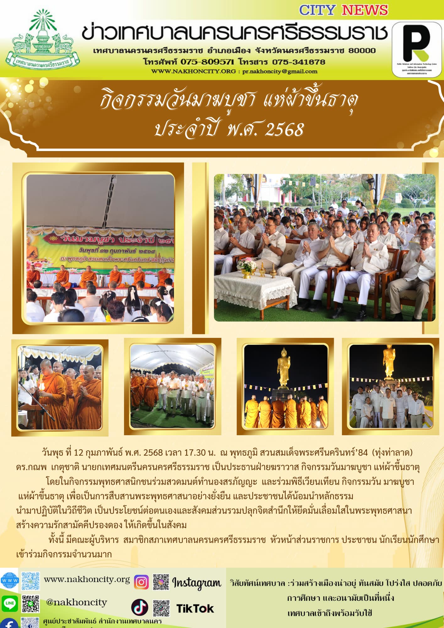 วันพุธ ที่ 12 กุมภาพันธ์ พ.ศ. 2568 เวลา 17.30 น. ณ พุทธภูมิ สวนสมเด็จพระศรีนครินทร์’84 (ทุ่งท่าลาด) ดร.กณพ เกตุชาติ นายกเทศมนตรีนครนครศรีธรรมราช เป็นประธานฝ่ายฆราวาส กิจกรรมวันมาฆบูชา แห่ผ้าขึ้นธาตุ ประจำปี 2568 โดยในกิจกรรมพุทธศาสนิกชนร่วมสวดมนต์ทำนองสรภัญญะ และร่วมพิธีเวียนเทียน กิจกรรมวัน มาฆบูชา แห่ผ้าขึ้นธาตุ เพื่อเป็นการสืบสานพระพุทธศาสนาอย่างยั่งยืน และประชาชนได้น้อมนำหลักธรรม นำมาปฏิบัติในวิถีชีวิต เป็นประโยชน์ต่อตนเองและสังคมส่วนรวมปลุกจิตสำนึกให้ยึดมั่นเลื่อมใสในพระพุทธศาสนา สร้างความรักสามัคคีปรองดอง ให้เกิดขึ้นในสังคม ทั้งนี้ มีคณะผู้บริหาร สมาชิกสภาเทศบาลนครนครศรีธรรมราช หัวหน้าส่วนราชการ ประชาชน นักเรียนนักศึกษา เข้าร่วมกิจกรรมจำนวนมาก |