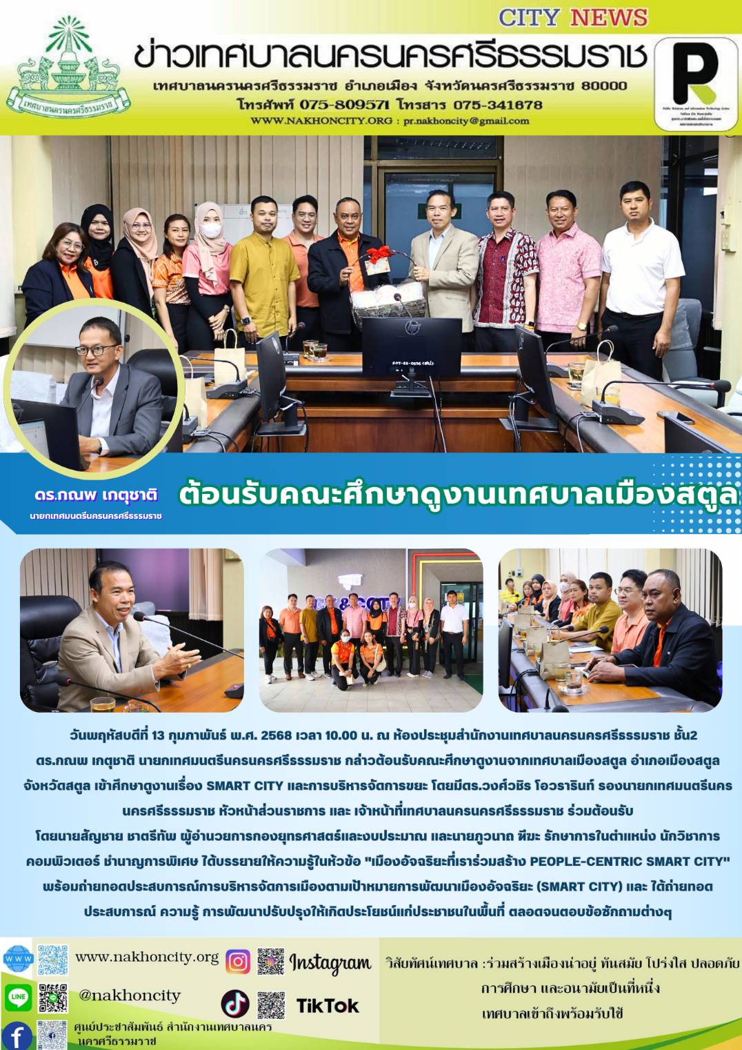 วันพฤหัสบดีที่ 13 กุมภาพันธ์ พ.ศ. 2568 เวลา 10.00 น. ณ ห้องประชุมสำนักงานเทศบาลนครนครศรีธรรมราช ชั้น2 ดร.กณพ เกตุชาติ นายกเทศมนตรีนครนครศรีธรรมราช กล่าวต้อนรับคณะศึกษาดูงานจากเทศบาลเมืองสตูล อำเภอเมืองสตูล จังหวัดสตูล เข้าศึกษาดูงานเรื่อง Smart City และการบริหารจัดการขยะ โดยมีดร.วงศ์วชิร โอวรารินท์ รองนายกเทศมนตรีนครนครศรีธรรมราช หัวหน้าส่วนราชการ และ เจ้าหน้าที่เทศบาลนครนครศรีธรรมราช ร่วมต้อนรับ โดยนายสัญชาย ชาตรีทัพ ผู้อำนวยการกองยุทธศาสตร์และงบประมาณ และนายภูวนาถ ฑีฆะ รักษาการในตำแหน่ง นักวิชาการคอมพิวเตอร์ ชำนาญการพิเศษ ได้บรรยายให้ความรู้ในห้วข้อ "เมืองอัจฉริยะที่เราร่วมสร้าง People-Centric Smart City" พร้อมถ่ายทอดประสบการณ์การบริหารจัดการเมืองตามเป้าหมายการพัฒนาเมืองอัจฉริยะ (Smart City) และ ได้ถ่ายทอดประสบการณ์ ความรู้ การพัฒนาปรับปรุงให้เกิดประโยชน์แก่ประชาชนในพื้นที่ ตลอดจนตอบข้อซักถามต่างๆ ............. ภาพ//ข่าว//จันทร์จิรา ตรวจททาน//ฐิตินันท์ |