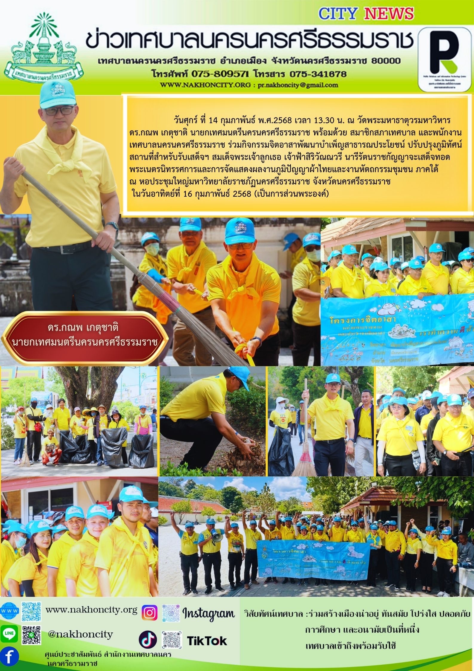 นายกเทศมนตรีนครนครศรีธรรมราช พร้อมด้วย สมาชิกสภาเทศบาล และพนักงานเทศบาลนครนครศรีธรรมราช ร่วมกิจกรรมจิตอาสาพัฒนาบำเพ็ญสาธารณประโยชน์ ปรับปรุงภูมิทัศน์สถานที่สำหรับรับเสด็จฯ สมเด็จพระเจ้าลูกเธอ เจ้าฟ้าสิริวัณณวรี นารีรัตนราชกัญญา |