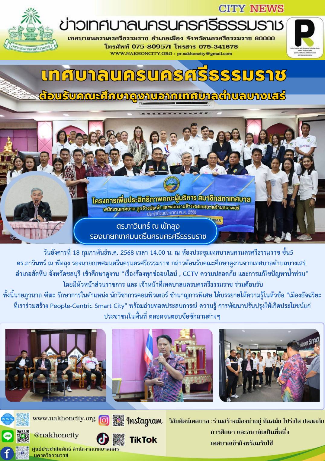 วันอังคารที่ 18 กุมภาพันธ์ พ.ศ. 2568 เวลา 14.00 น. ณ ห้องประชุมเทศบาลนครนครศรีธรรมราช ชั้น5 ดร.ภาวินทร์ ณ พัทลุง รองนายกเทศมนตรีนครนครศรีธรรมราช กล่าวต้อนรับคณะศึกษาดูงานจากเทศบาลตำบลบางเสร่ อำเภอสัตหีบ จังหวัดชลบุรี เข้าศึกษาดูงาน “เรื่องร้องทุกข์ออนไลน์ , CCTV ความปลอดภัย และการแก้ไขปัญหาน้ำท่วม” โดยมีหัวหน้าส่วนราชการ และ เจ้าหน้าที่เทศบาลนครนครศรีธรรมราช ร่วมต้อนรับ ทั้งนี้นายภูวนาถ ฑีฆะ รักษาการในตำแหน่ง นักวิชาการคอมพิวเตอร์ ชำนาญการพิเศษ ได้บรรยายให้ความรู้ในห้วข้อ "เมืองอัจฉริยะที่เราร่วมสร้าง People-Centric Smart City" พร้อมถ่ายทอดประสบการณ์ ความรู้ การพัฒนาปรับปรุงให้เกิดประโยชน์แก่ประชาชนในพื้นที่ ตลอดจนตอบข้อซักถามต่างๆ ............... ภาพ//ข่าว//จันทร์จิรา ตรวจทาน//ฐิตินันท์ |