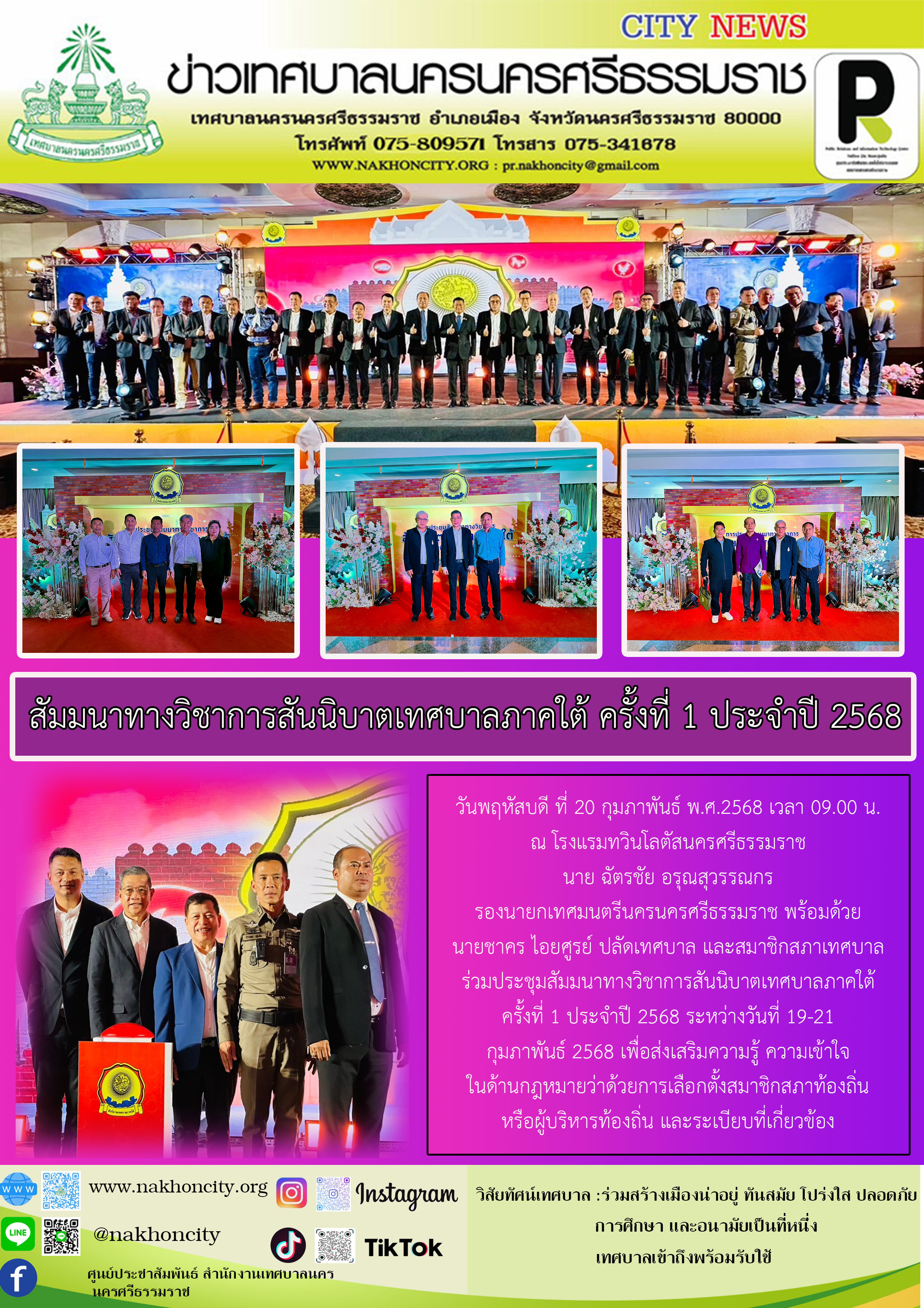 รองนายกเทศมนตรีนครนครศรีธรรมราช พร้อมด้วย ปลัดเทศบาล และสมาชิกสภาเทศบาล ร่วมประชุมสัมมนาทางวิชาการสันนิบาตเทศบาลภาคใต้ ครั้งที่ 1 ประจำปี 2568 ระหว่างวันที่ 19-21 กุมภาพันธ์ 2568 |