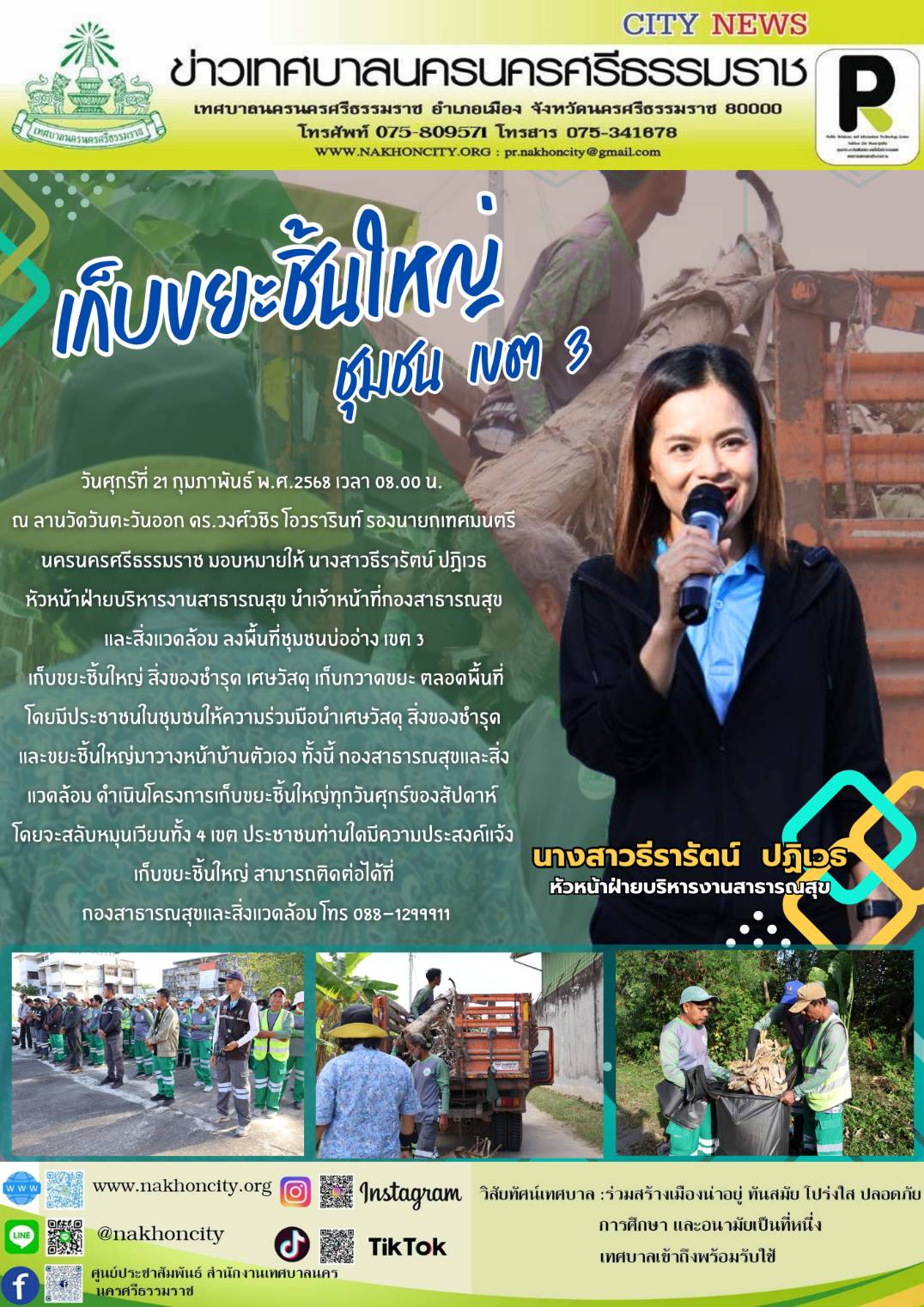 วันศุกร์ที่ 21 กุมภาพันธ์ พ.ศ.2568 เวลา 08.00 น. ณ ลานวัดวันตะวันออก ดร.วงศ์วชิร โอวรารินท์ รองนายกเทศมนตรีนครนครศรีธรรมราช มอบหมายให้ นางสาวธีรารัตน์ ปฏิเวธ หัวหน้าฝ่ายบริหารงานสาธารณสุข นำเจ้าหน้าที่กองสาธารณสุขและสิ่งแวดล้อม ลงพื้นที่ชุมชนบ่ออ่าง เขต 3 เก็บขยะชิ้นใหญ่ สิ่งของชำรุด เศษวัสดุ เก็บกวาดขยะ ตลอดพื้นที่ โดยมีประชาชนในชุมชนให้ความร่วมมือนำเศษวัสดุ สิ่งของชำรุด และขยะชิ้นใหญ่มาวางหน้าบ้านตัวเอง ทั้งนี้ กองสาธารณสุขและสิ่งแวดล้อม ดำเนินโครงการเก็บขยะชิ้นใหญ่ทุกวันศุกร์ของสัปดาห์ โดยจะสลับหมุนเวียนทั้ง 4 เขต ประชาชนท่านใดมีความประสงค์แจ้งเก็บขยะชิ้นใหญ่ สามารถติดต่อได้ที่ กองสาธารณสุขและสิ่งแวดล้อม โทร 088-1299911 .............. ภาพ//ข่าว//จันทร์จิรา |
