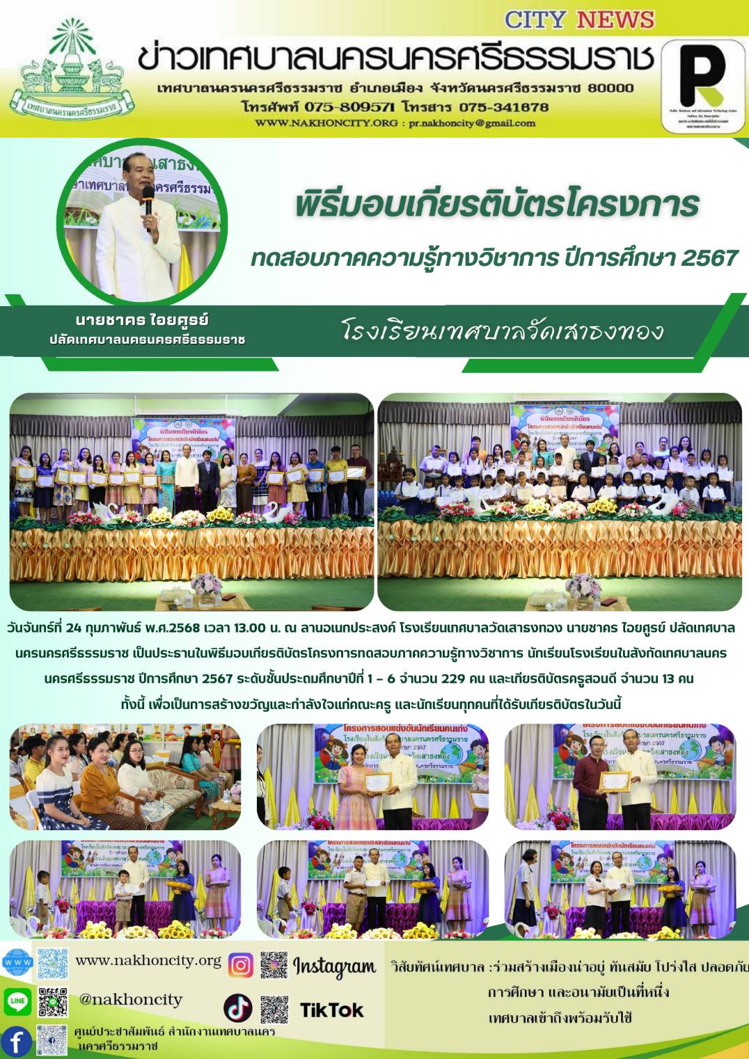 นายชาคร ไอยศูรย์ ปลัดเทศบาลนครนครศรีธรรมราช เป็นประธานในพิธีมอบเกียรติบัตรโครงการทดสอบภาคความรู้ทางวิชาการ นักเรียนโรงเรียนเทศบาลวัดเสาธงทอง |