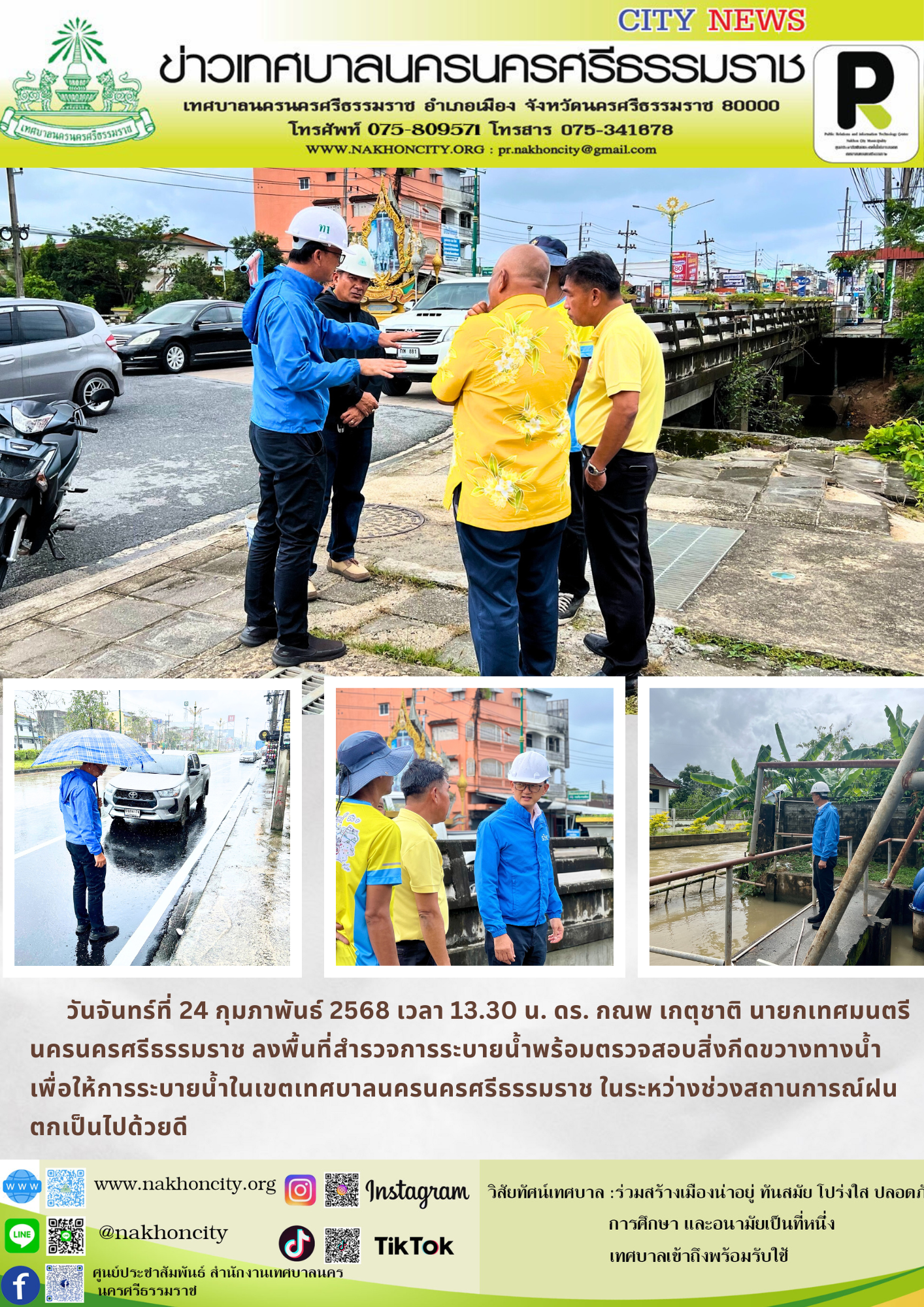 วันจันทร์ที่ 24 กุมภาพันธ์ 2568 เวลา 13.30 น. ดร. กณพ เกตุชาติ นายกเทศมนตรีนครนครศรีธรรมราช ลงพื้นที่สำรวจการระบายน้ำพร้อมตรวจสอบสิ่งกีดขวางทางน้ำ เพื่อให้การระบายน้ำในเขตเทศบาลนครนครศรีธรรมราช ในระหว่างช่วงสถานการณ์ฝนตกเป็นไปด้วยดี |