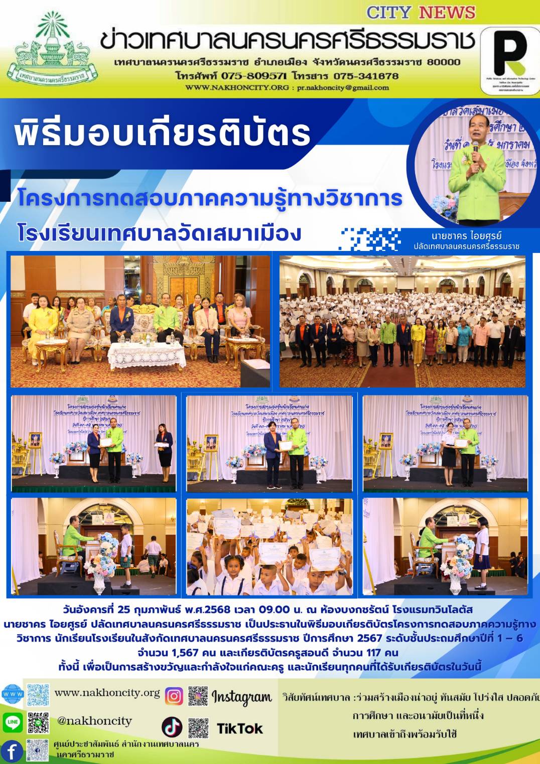 นายชาคร ไอยศูรย์ ปลัดเทศบาลนครนครศรีธรรมราช เป็นประธานในพิธีมอบเกียรติบัตรโครงการทดสอบภาคความรู้ทางวิชาการ นักเรียนโรงเรียนเทศบาลวัดเสมาเมือง |