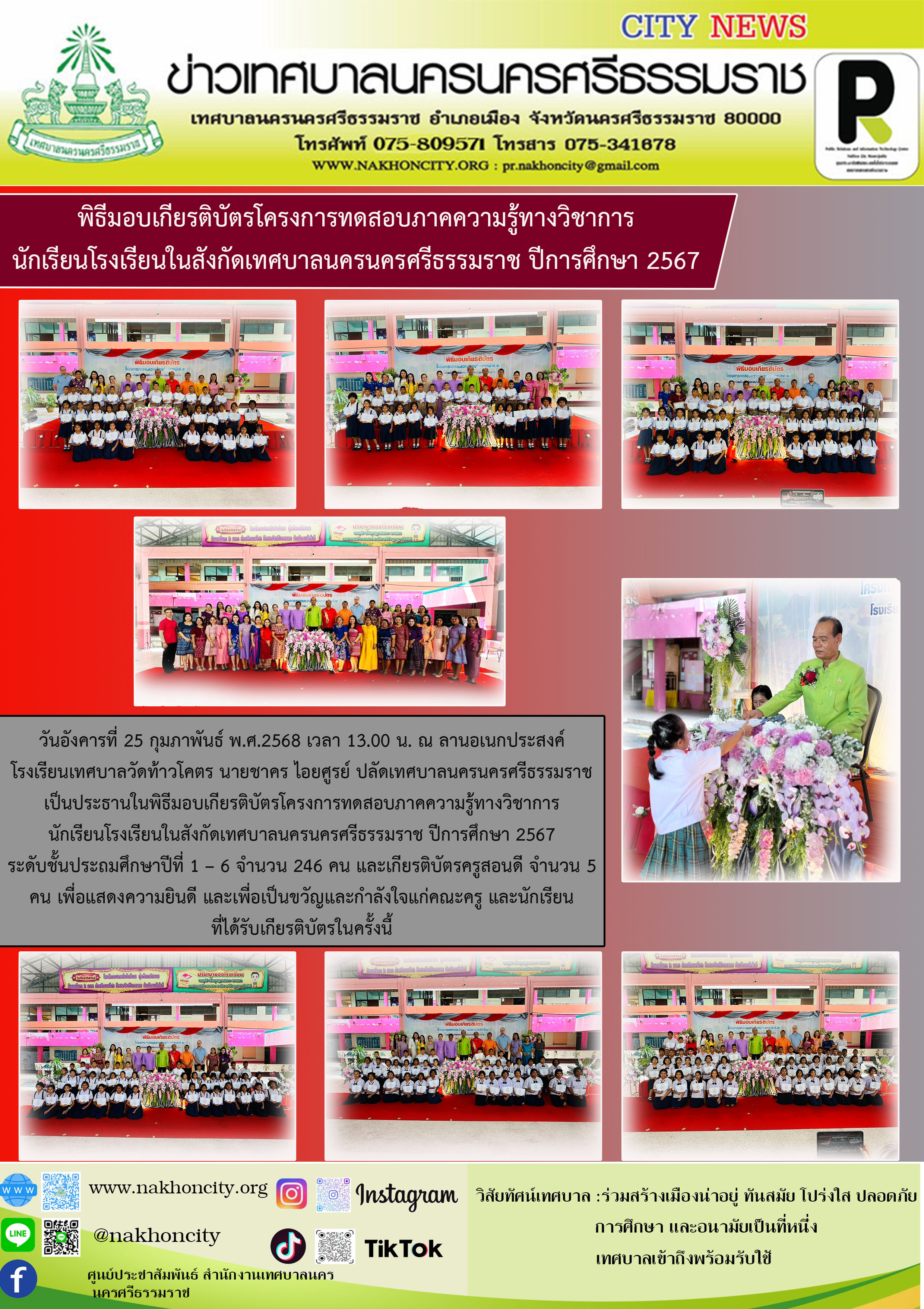 วันอังคารที่ 25 กุมภาพันธ์ พ.ศ.2568 เวลา 13.00 น. ณ ลานอเนกประสงค์ โรงเรียนเทศบาลวัดท้าวโคตร นายชาคร ไอยศูรย์ ปลัดเทศบาลนครนครศรีธรรมราช เป็นประธานในพิธีมอบเกียรติบัตรโครงการทดสอบภาคความรู้ทางวิชาการ นักเรียนโรงเรียนในสังกัดเทศบาลนครนครศรีธรรมราช ปีการศึกษา 2567 ระดับชั้นประถมศึกษาปีที่ 1 – 6 จำนวน 246 คน และเกียรติบัตรครูสอนดี จำนวน 5 คน เพื่อแสดงความยินดี และเพื่อเป็นขวัญและกำลังใจแก่คณะครู และนักเรียน ที่ได้รับเกียรติบัตรในครั้งนี้