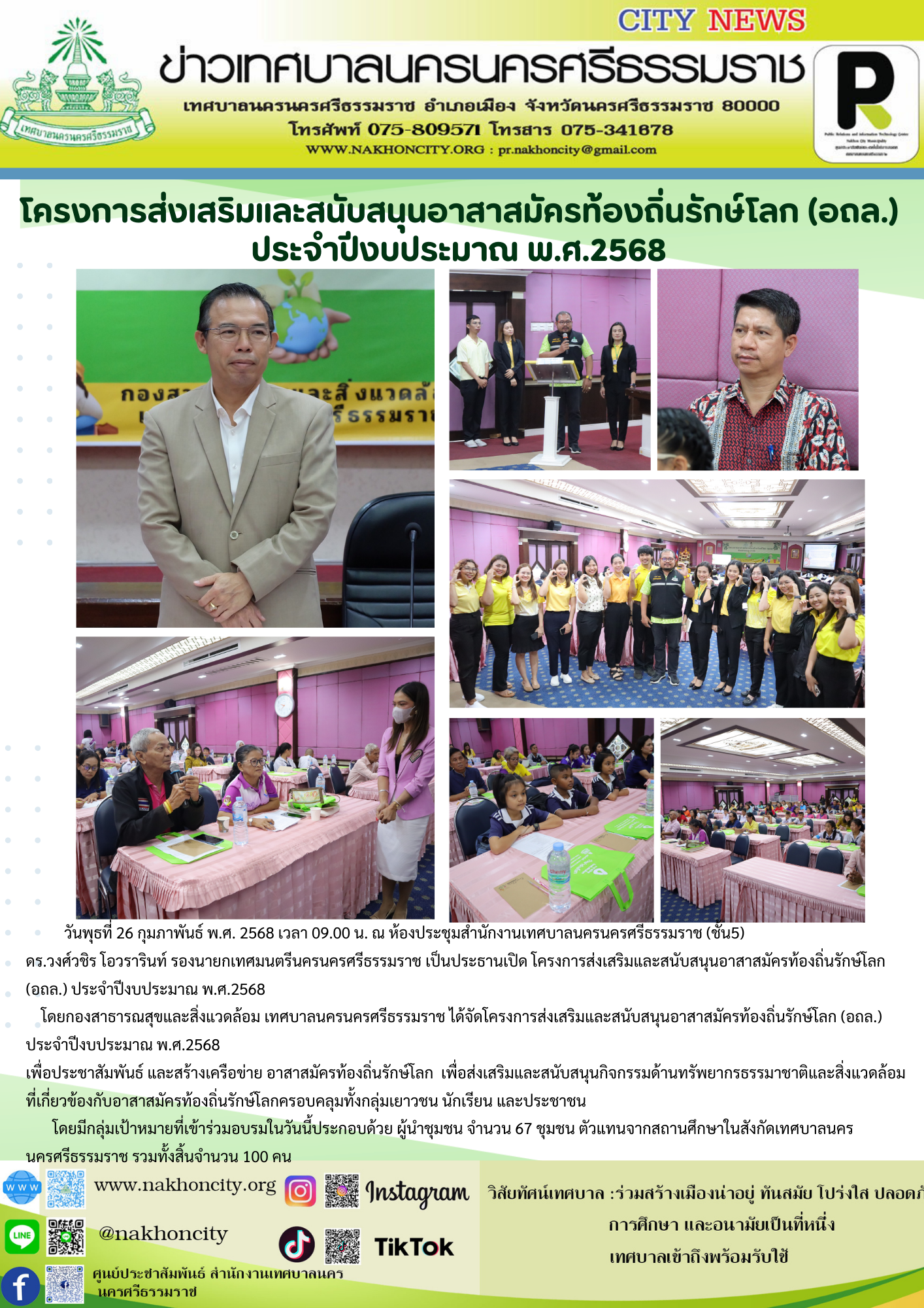 ดร.วงศ์วชิร โอวรารินท์ รองนายกเทศมนตรีนครนครศรีธรรมราช เป็นประธานเปิด โครงการส่งเสริมและสนับสนุนอาสาสมัครท้องถิ่นรักษ์โลก (อถล.) ประจำปีงบประมาณ พ.ศ.2568 |