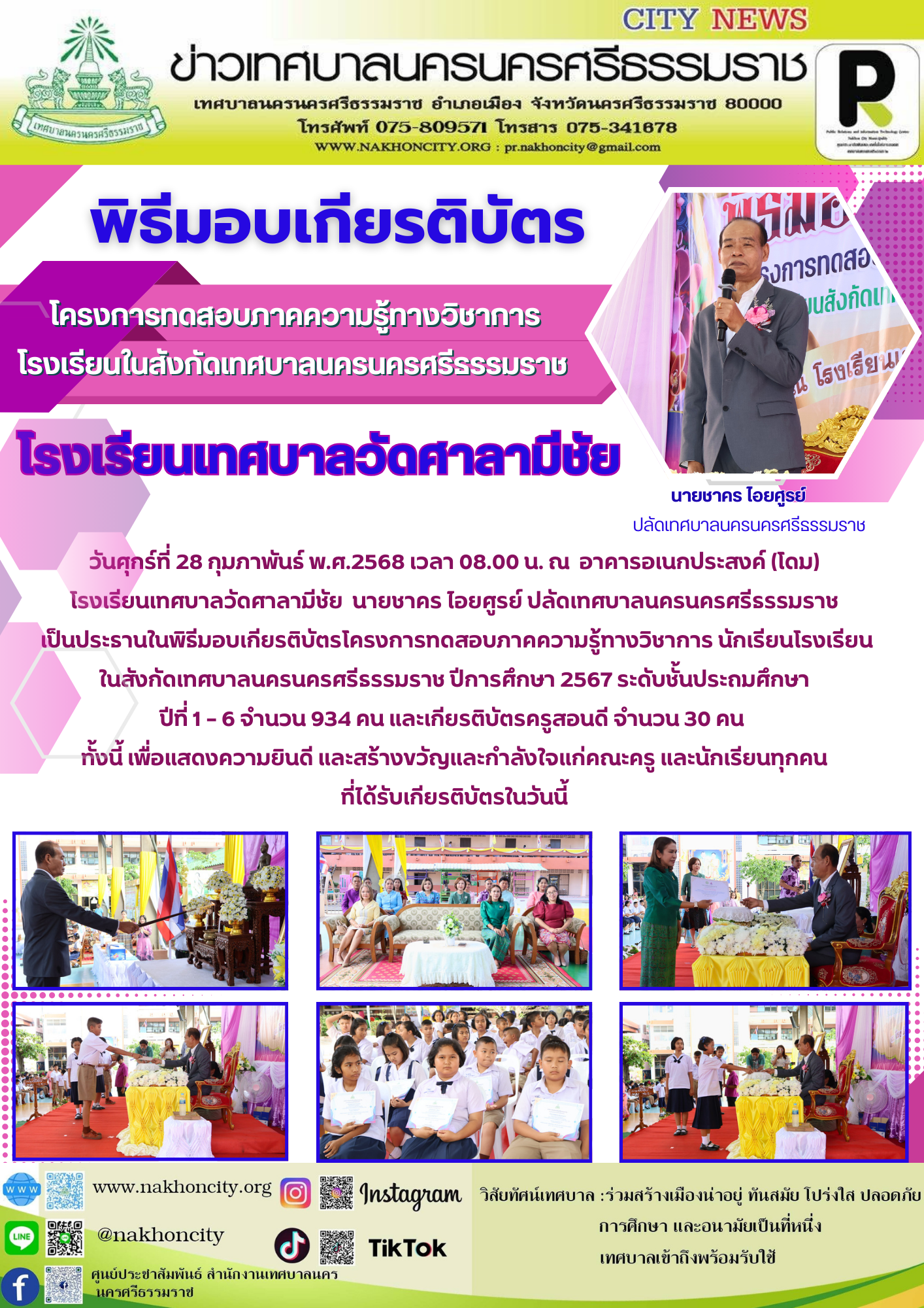 วันศุกร์ที่ 28 กุมภาพันธ์ พ.ศ.2568 เวลา 08.30 น. ณ อาคารอเนกประสงค์ (โดม)โรงเรียนเทศบาลวัดศาลามีชัย นายชาคร ไอยศูรย์ ปลัดเทศบาลนครนครศรีธรรมราช เป็นประธานในพิธีมอบเกียรติบัตรโครงการทดสอบภาคความรู้ทางวิชาการ นักเรียนโรงเรียนในสังกัดเทศบาลนครนครศรีธรรมราช ปีการศึกษา 2567 ระดับชั้นประถมศึกษาปีที่ 1 – 6 จำนวน 934 คน และเกียรติบัตรครูสอนดี จำนวน 30 คน |