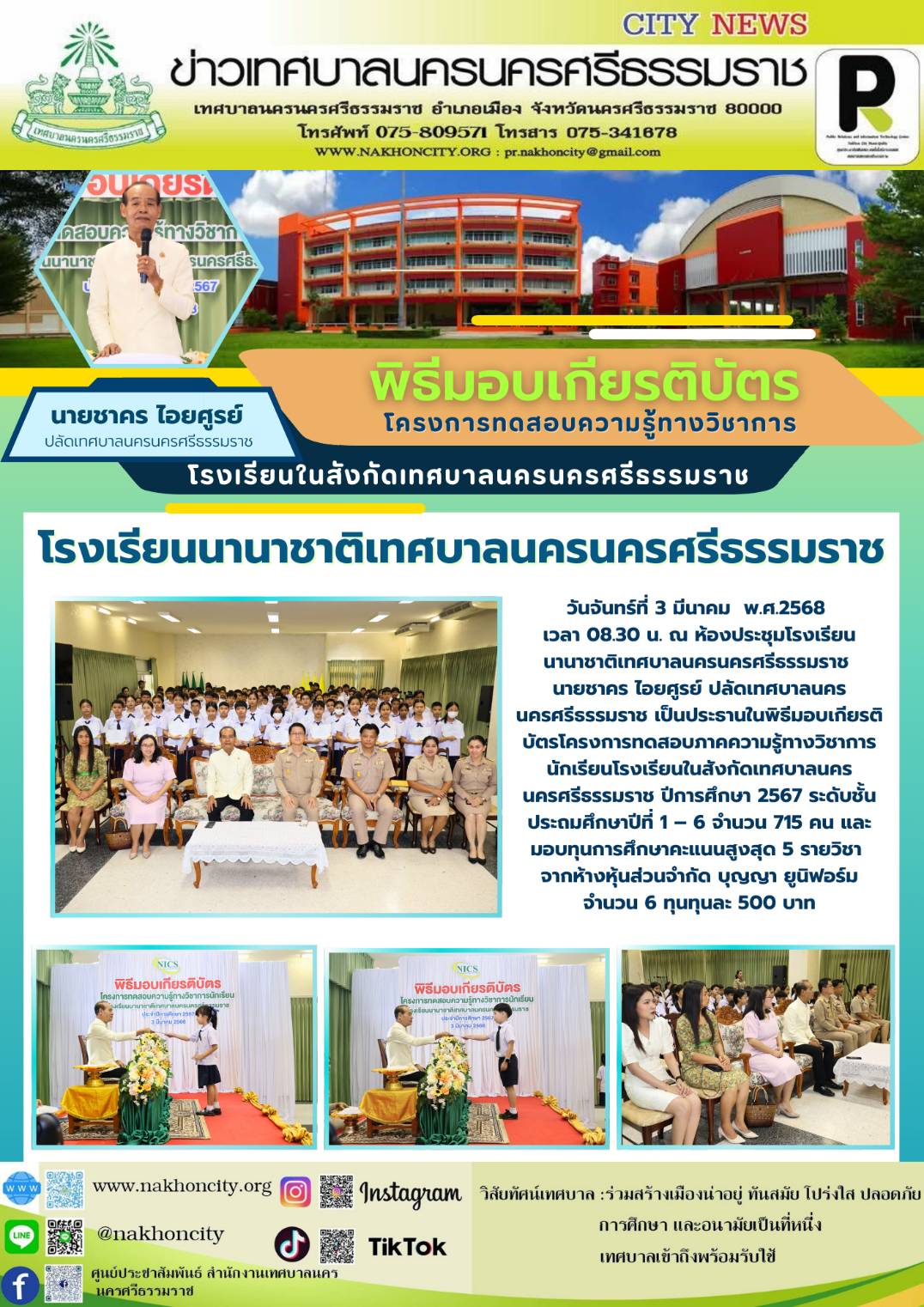วันจันทร์ที่ 3 มีนาคม พ.ศ.2568 เวลา 08.30 น. ณ ห้องประชุมโรงเรียนนานาชาติเทศบาลนครนครศรีธรรมราช นายชาคร ไอยศูรย์ ปลัดเทศบาลนครนครศรีธรรมราช เป็นประธานในพิธีมอบเกียรติบัตรโครงการทดสอบภาคความรู้ทางวิชาการ นักเรียนโรงเรียนในสังกัดเทศบาลนครนครศรีธรรมราช ปีการศึกษา 2567 ระดับชั้นประถมศึกษาปีที่ 1 – 6 จำนวน 715 คน และมอบทุนการศึกษาคะแนนสูงสุด 5 รายวิชา จากห้างหุ้นส่วนจำกัด บุญญา ยูนิฟอร์ม จำนวน 6 ทุนทุนละ 500 บาท ทั้งนี้ เพื่อแสดงความยินดี และสร้างขวัญและกำลังใจแก่คณะครู และนักเรียนทุกคนที่ได้รับเกียรติบัตรในวันนี้ ................... ภาพ//ข่าว//จันทร์จิรา |
