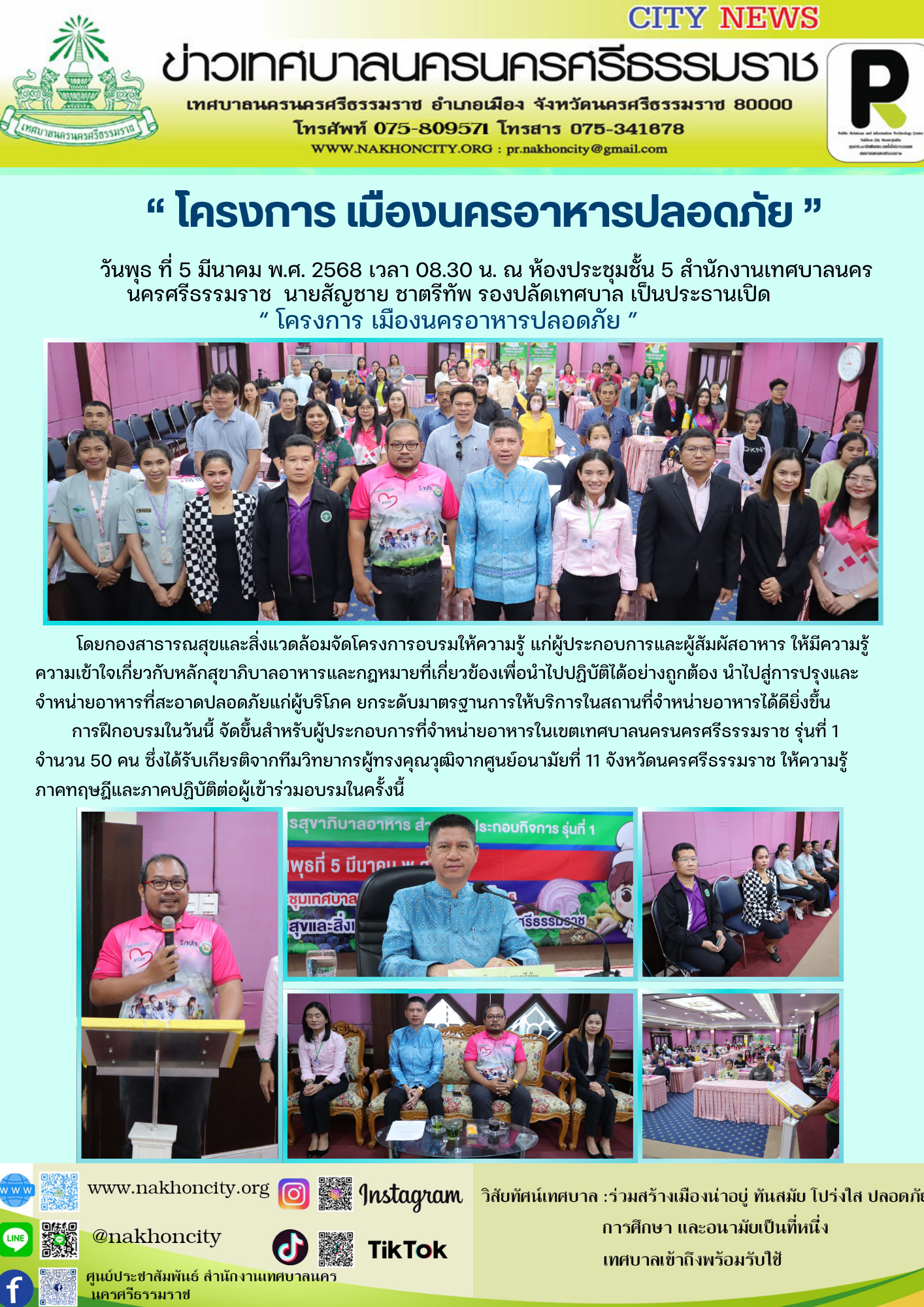 วันพุธ ที่ 5 มีนาคม พ.ศ. 2568 เวลา 08.30 น. ณ ห้องประชุมชั้น5 สำนักงานเทศบาลนครนครศรีธรรมราช นายสัญชาย ชาตรีทัพ รองปลัดเทศบาล เป็นประธานเปิด “โครงการ เมืองนครอาหารปลอดภัย” โดยกองสาธารณสุขและสิ่งแวดล้อมจัดโครงการอบรมให้ความรู้ แก่ผู้ประกอบการและผู้สัมผัสอาหาร ให้มีความรู้ความเข้าใจเกี่ยวกับหลักสุขาภิบาลอาหารและกฎหมายที่เกี่ยวข้องเพื่อนำไปปฏิบัติได้อย่างถูกต้อง นำไปสู่การปรุงและจำหน่ายอาหารที่สะอาดปลอดภัยแก่ผู้บริโภค ยกระดับมาตรฐานการให้บริการในสถานที่จำหน่ายอาหารได้ดียิ่งขึ้น การฝึกอบรมในวันนี้ จัดขึ้นสำหรับผู้ประกอบการที่จำหน่ายอาหารในเขตเทศบาลนครนครศรีธรรมราช รุ่นที่ 1 จำนวน 50 คน ซึ่งได้รับเกียรติจากทีมวิทยากรผู้ทรงคุณวุฒิจากศูนย์อนามัยที่ 11 จังหวัดนครศรีธรรมราช ให้ความรู้ภาคทฤษฎีและภาคปฏิบัติต่อผู้เข้าร่วมอบรมในครั้งนี้ |