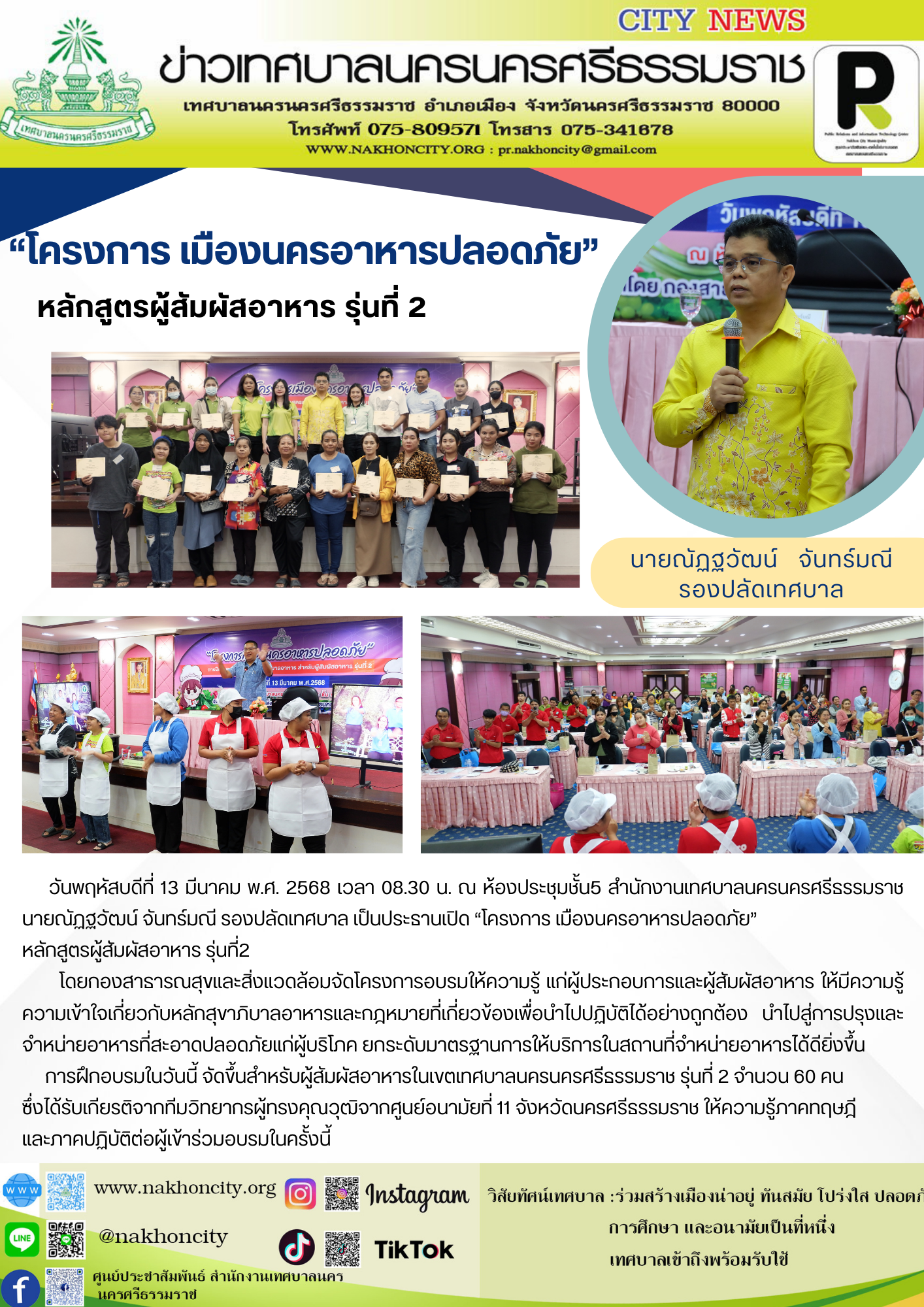 วันพฤหัสบดีที่ 13 มีนาคม พ.ศ. 2568 เวลา 08.30 น. ณ ห้องประชุมชั้น5 สำนักงานเทศบาลนครนครศรีธรรมราช นายณัฏฐวัฒน์ จันทร์มณี รองปลัดเทศบาล เป็นประธานเปิด “โครงการ เมืองนครอาหารปลอดภัย” หลักสูตรผู้สัมผัสอาหาร รุ่นที่2 โดยกองสาธารณสุขและสิ่งแวดล้อมจัดโครงการอบรมให้ความรู้ แก่ผู้ประกอบการและผู้สัมผัสอาหาร ให้มีความรู้ความเข้าใจเกี่ยวกับหลักสุขาภิบาลอาหารและกฎหมายที่เกี่ยวข้องเพื่อนำไปปฏิบัติได้อย่างถูกต้อง นำไปสู่การปรุงและจำหน่ายอาหารที่สะอาดปลอดภัยแก่ผู้บริโภค ยกระดับมาตรฐานการให้บริการในสถานที่จำหน่ายอาหารได้ดียิ่งขึ้น การฝึกอบรมในวันนี้ จัดขึ้นสำหรับผู้สัมผัสอาหารในเขตเทศบาลนครนครศรีธรรมราช รุ่นที่ 2จำนวน 60 คน ซึ่งได้รับเกียรติจากทีมวิทยากรผู้ทรงคุณวุฒิจากศูนย์อนามัยที่ 11 จังหวัดนครศรีธรรมราช ให้ความรู้ภาคทฤษฎีและภาคปฏิบัติต่อผู้เข้าร่วมอบรมในครั้งนี้ |