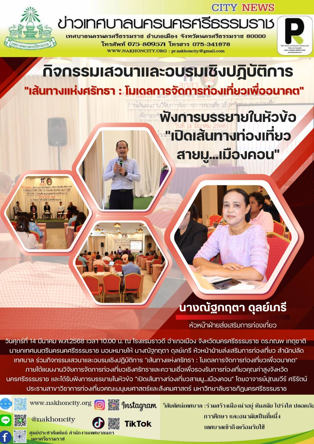 วันศุกร์ทื่ 14 มีนาคม พ.ศ.2568 เวลา 10.00 น. ณ โรงแรมราวดี อำเภอเมือง จังหวัดนครศรีธรรมราช ดร.กณพ เกตุชาติ นายกเทศมนตรีนครนคศรีธรรมราช มอบหมายให้ นางณัฐกฤตา ดุลย์เภรี หัวหน้าฝ่ายส่งเสริมการท่องเที่ยว สำนักปลัดเทศบาล ร่วมกิจกรรมเสวนาและอบรมเชิงปฏิบัติการ "เส้นทางแห่งศรัทธา : โมเดลการจัดการท่องเที่ยวเพื่ออนาคต" ภายใต้แผนงานวิจัยการจัดการท่องเที่ยวเชิงศรัทธาและความเชื่อเพื่อรองรับการท่องเที่ยวคุณค่าสูงจังหวัดนครศรีธรรมราช และได้รับฟังการบรรยายในหัวข้อ "เปิดเส้นทางท่องเที่ยวสายมู...เมืองคอน" โดยอาจารย์ปุณยวีร์ ศรีรัตน์ ประธานสาขาวิชาการท่องเที่ยวคณะมนุษยศาสตร์และสังคมศาสตร์ มหาวิทยาลัยราชภัฏนครศรีธรรมราช ............ ภาพ//ข่าว//จันทร์จิรา ตรวจทาน//ฐิตินันท์ |