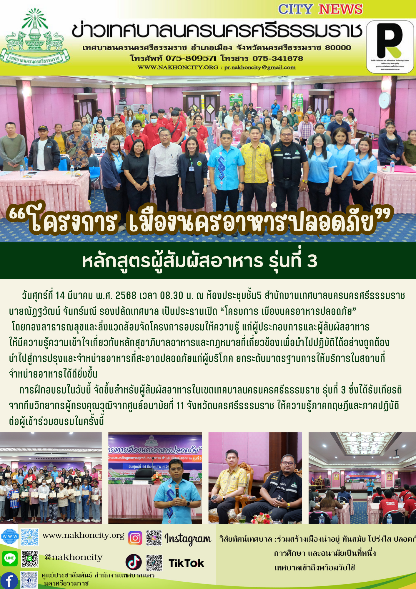วันศุกร์ที่ 14 มีนาคม พ.ศ. 2568 เวลา 08.30 น. ณ ห้องประชุมชั้น5 สำนักงานเทศบาลนครนครศรีธรรมราช นายณัฏฐวัฒน์ จันทร์มณี รองปลัดเทศบาล เป็นประธานเปิด “โครงการ เมืองนครอาหารปลอดภัย” หลักสูตรผู้สัมผัสอาหาร รุ่นที่ 3 โดยกองสาธารณสุขและสิ่งแวดล้อมจัดโครงการอบรมให้ความรู้ แก่ผู้ประกอบการและผู้สัมผัสอาหาร ให้มีความรู้ความเข้าใจเกี่ยวกับหลักสุขาภิบาลอาหารและกฎหมายที่เกี่ยวข้องเพื่อนำไปปฏิบัติได้อย่างถูกต้อง นำไปสู่การปรุงและจำหน่ายอาหารที่สะอาดปลอดภัยแก่ผู้บริโภค ยกระดับมาตรฐานการให้บริการในสถานที่จำหน่ายอาหารได้ดียิ่งขึ้น การฝึกอบรมในวันนี้ จัดขึ้นสำหรับผู้สัมผัสอาหารในเขตเทศบาลนครนครศรีธรรมราช รุ่นที่ 3 ซึ่งได้รับเกียรติจากทีมวิทยากรผู้ทรงคุณวุฒิจากศูนย์อนามัยที่ 11 จังหวัดนครศรีธรรมราช ให้ความรู้ภาคทฤษฎีและภาคปฏิบัติต่อผู้เข้าร่วมอบรมในครั้งนี้ |