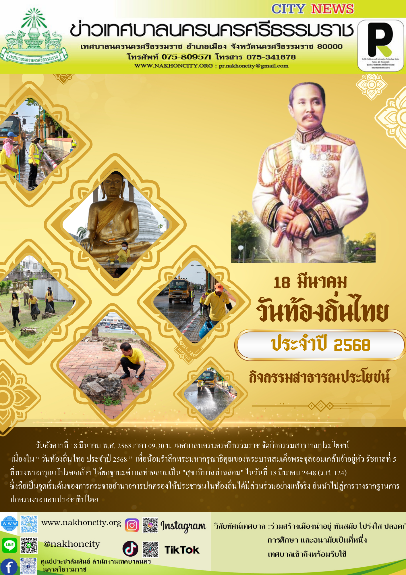 วันอังคารที่ 18 มีนาคม พ.ศ. 2568 เวลา 09.30 น. เทศบาลนครนครศรีธรรมราช จัดกิจกรรมสาธารณประโยชน์ เนื่องใน “ วันท้องถิ่นไทย ประจำปี 2568 ” เพื่อน้อมรำลึกพระมหากรุณาธิคุณของพระบาทสมเด็จพระจุลจอมเกล้าเจ้าอยู่หัว รัชกาลที่ 5 ที่ทรงพระกรุณาโปรดเกล้าฯ ให้ยกฐานะตำบลท่าฉลอมเป็น "สุขาภิบาลท่าฉลอม" ในวันที่ 18 มีนาคม 2448 (ร.ศ. 124) ซึ่งถือเป็นจุดเริ่มต้นของการกระจายอำนาจการปกครองให้ประชาชนในท้องถิ่นได้มีส่วนร่วมอย่างแท้จริง อันนำไปสู่การวางรากฐานการปกครองระบอบประชาธิปไตย |