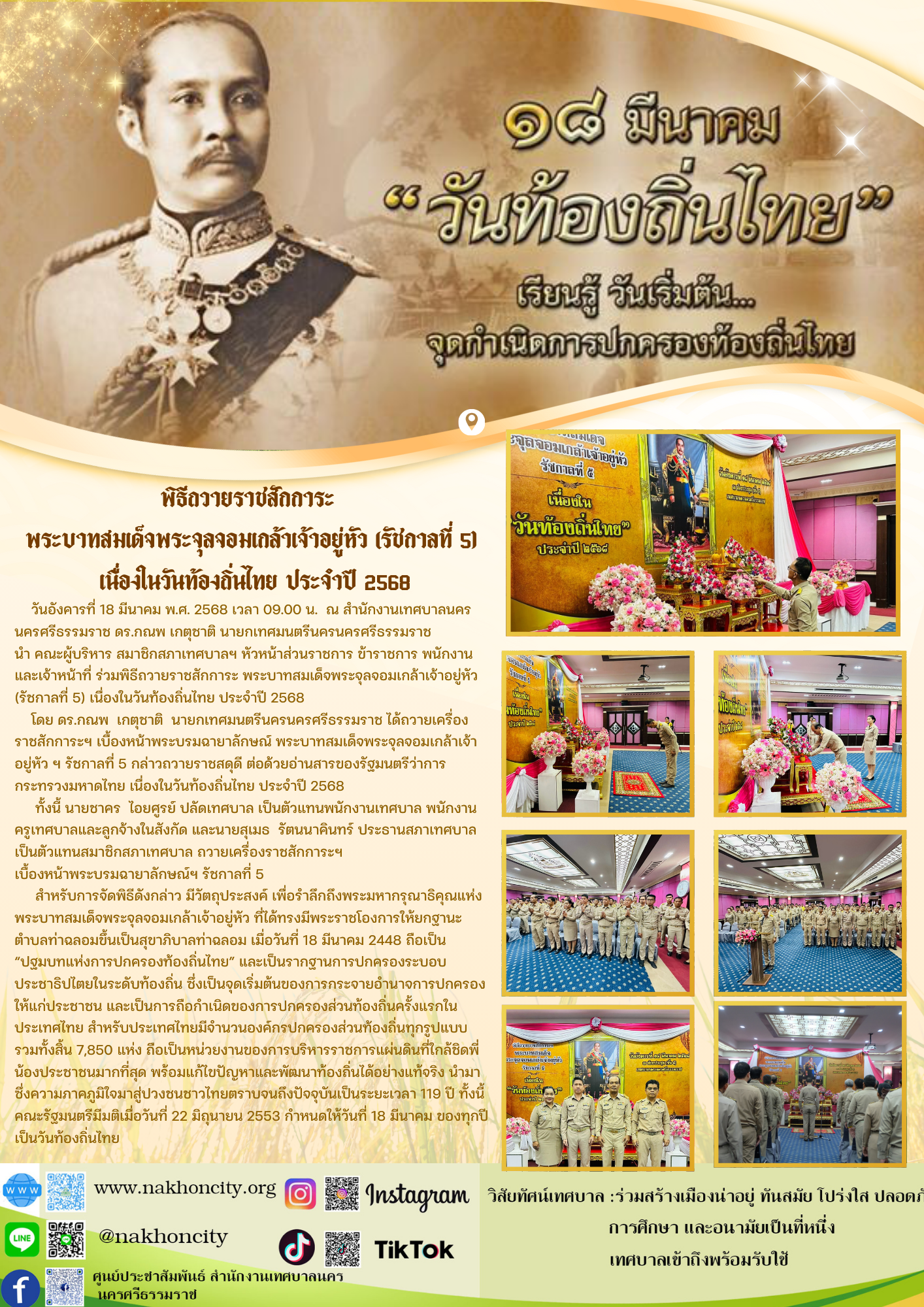 วันอังคารที่ 18 มีนาคม พ.ศ. 2568 เวลา 09.00 น. ณ สำนักงานเทศบาลนครนครศรีธรรมราช ดร.กณพ เกตุชาติ นายกเทศมนตรีนครนครศรีธรรมราช นำ คณะผู้บริหาร สมาชิกสภาเทศบาลฯ หัวหน้าส่วนราชการ ข้าราชการ พนักงานและเจ้าหน้าที่ ร่วมพิธีถวายราชสักการะ พระบาทสมเด็จพระจุลจอมเกล้าเจ้าอยู่หัว (รัชกาลที่ 5) เนื่องในวันท้องถิ่นไทย ประจำปี 2568 โดย ดร.กณพ เกตุชาติ นายกเทศมนตรีนครนครศรีธรรมราช ได้ถวายเครื่องราชสักการะฯ เบื้องหน้าพระบรมฉายาลักษณ์ พระบาทสมเด็จพระจุลจอมเกล้าเจ้าอยู่หัว ฯ รัชกาลที่ 5 กล่าวถวายราชสดุดี ต่อด้วยอ่านสารของรัฐมนตรีว่าการกระทรวงมหาดไทย เนื่องในวันท้องถิ่นไทย ประจำปี 2568 ทั้งนี้ นายชาคร ไอยศูรย์ ปลัดเทศบาล เป็นตัวแทนพนักงานเทศบาล พนักงานครูเทศบาลและลูกจ้างในสังกัด และนายสุเมธ รัตนนาคินทร์ ประธานสภาเทศบาล เป็นตัวแทนสมาชิกสภาเทศบาล ถวายเครื่องราชสักการะฯ เบื้องหน้าพระบรมฉายาลักษณ์ฯ รัชกาลที่ 5 สำหรับการจัดพิธีดังกล่าว มีวัตถุประสงค์ เพื่อรำลึกถึงพระมหากรุณาธิคุณแห่ง พระบาทสมเด็จพระจุลจอมเกล้าเจ้าอยู่หัว ที่ได้ทรงมีพระราชโองการให้ยกฐานะตำบลท่าฉลอมขึ้นเป็นสุขาภิบาลท่าฉลอม เมื่อวันที่ 18 มีนาคม 2448 ถือเป็น “ปฐมบทแห่งการปกครองท้องถิ่นไทย” และเป็นรากฐานการปกครองระบอบประชาธิปไตยในระดับท้องถิ่น ซึ่งเป็นจุดเริ่มต้นของการกระจายอำนาจการปกครองให้แก่ประชาชน และเป็นการถือกำเนิดของการปกครองส่วนท้องถิ่นครั้งแรกในประเทศไทย สำหรับประเทศไทยมีจำนวนองค์กรปกครองส่วนท้องถิ่นทุกรูปแบบ รวมทั้งสิ้น 7,850 แห่ง ถือเป็นหน่วยงานของการบริหารราชการแผ่นดินที่ใกล้ชิดพี่น้องประชาชนมากที่สุด พร้อมแก้ไขปัญหาและพัฒนาท้องถิ่นได้อย่างแท้จริง นำมาซึ่งความภาคภูมิใจมาสู่ปวงชนชาวไทยตราบจนถึงปัจจุบันเป็นระยะเวลา 119 ปี ทั้งนี้ คณะรัฐมนตรีมีมติเมื่อวันที่ 22 มิถุนายน 2553 กำหนดให้วันที่ 18 มีนาคม ของทุกปี เป็นวันท้องถิ่นไทย