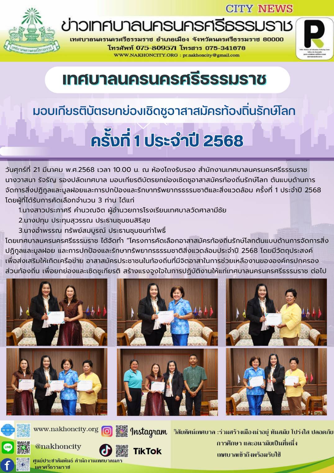 วันศุกร์ที่ 21 มีนาคม พ.ศ.2568 เวลา 10.00 น. ณ ห้องโถงรับรอง สำนักงานเทศบาลนครนครศรีธรรมราช นางวาสนา รัจรัญ รองปลัดเทศบาล มอบเกียรติบัตรยกย่องเชิดชูอาสาสมัครท้องถิ่นรักษ์โลก ต้นแบบด้านการจัดการสิ่งปฏิกูลและมูลฝอยและการปกป้องและรักษาทรัพยากรธรรมชาติและสิ่งแวดล้อม ครั้งที่ 1 ประจำปี 2568 โดยผู้ที่ได้รับการคัดเลือกจำนวน 3 ท่าน ได้แก่