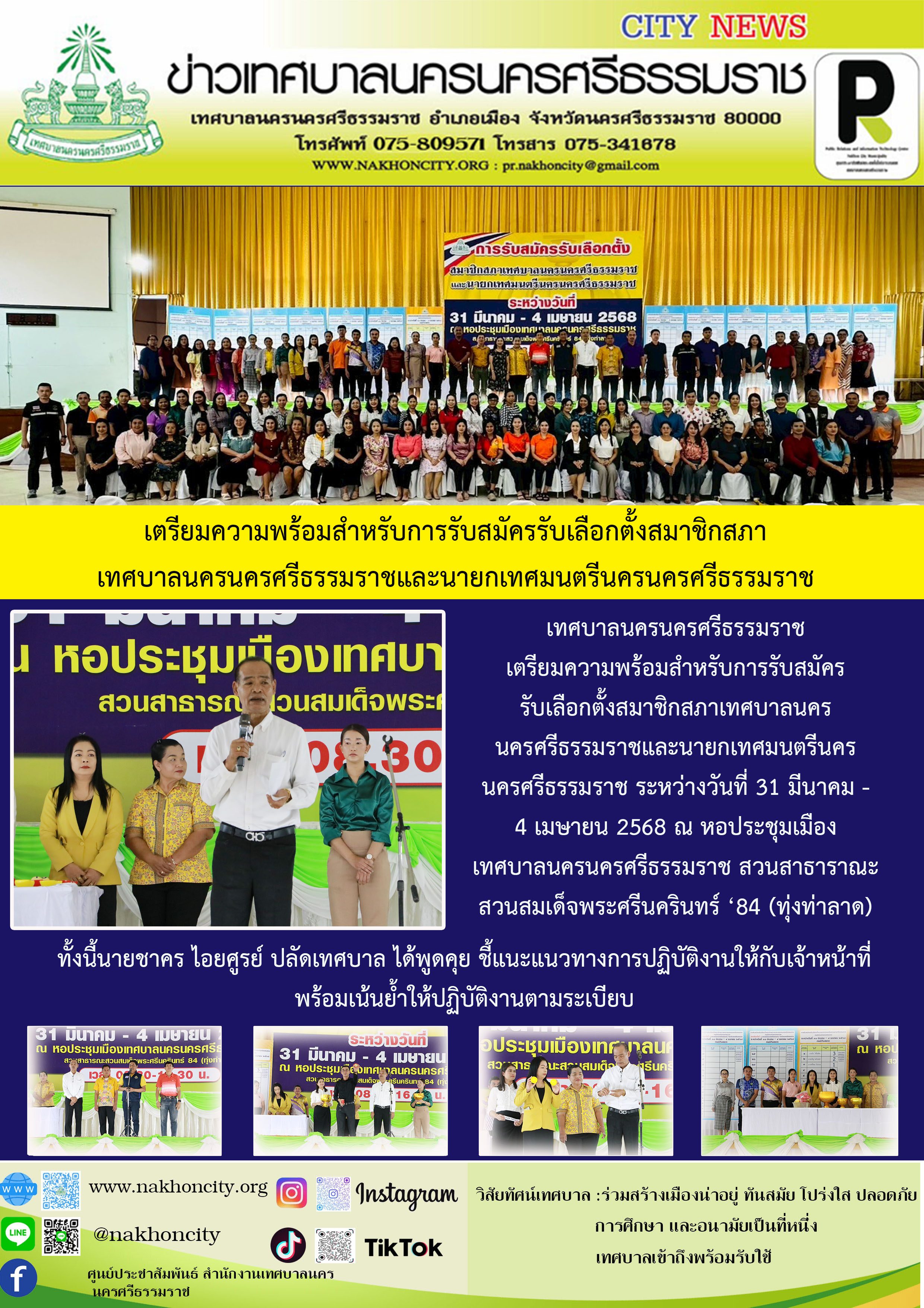 เทศบาลนครนครศรีธรรมราช เตรียมความพร้อมสำหรับการรับสมัครรับเลือกตั้ง สมาชิกสภาเทศบาลนครนครศรีธรรมราช และนายกเทศมนตรีนครนครศรีธรรมราช ระหว่างวันที่ 31 มีนาคม - 4 เมษายน 2568 ณ หอประชุมเมืองเทศบาลนครนครศรีธรรมราช สวนสาธาราณะสวนสมเด็จพระศรีนครินทร์ ‘84 (ทุ่งท่าลาด) |