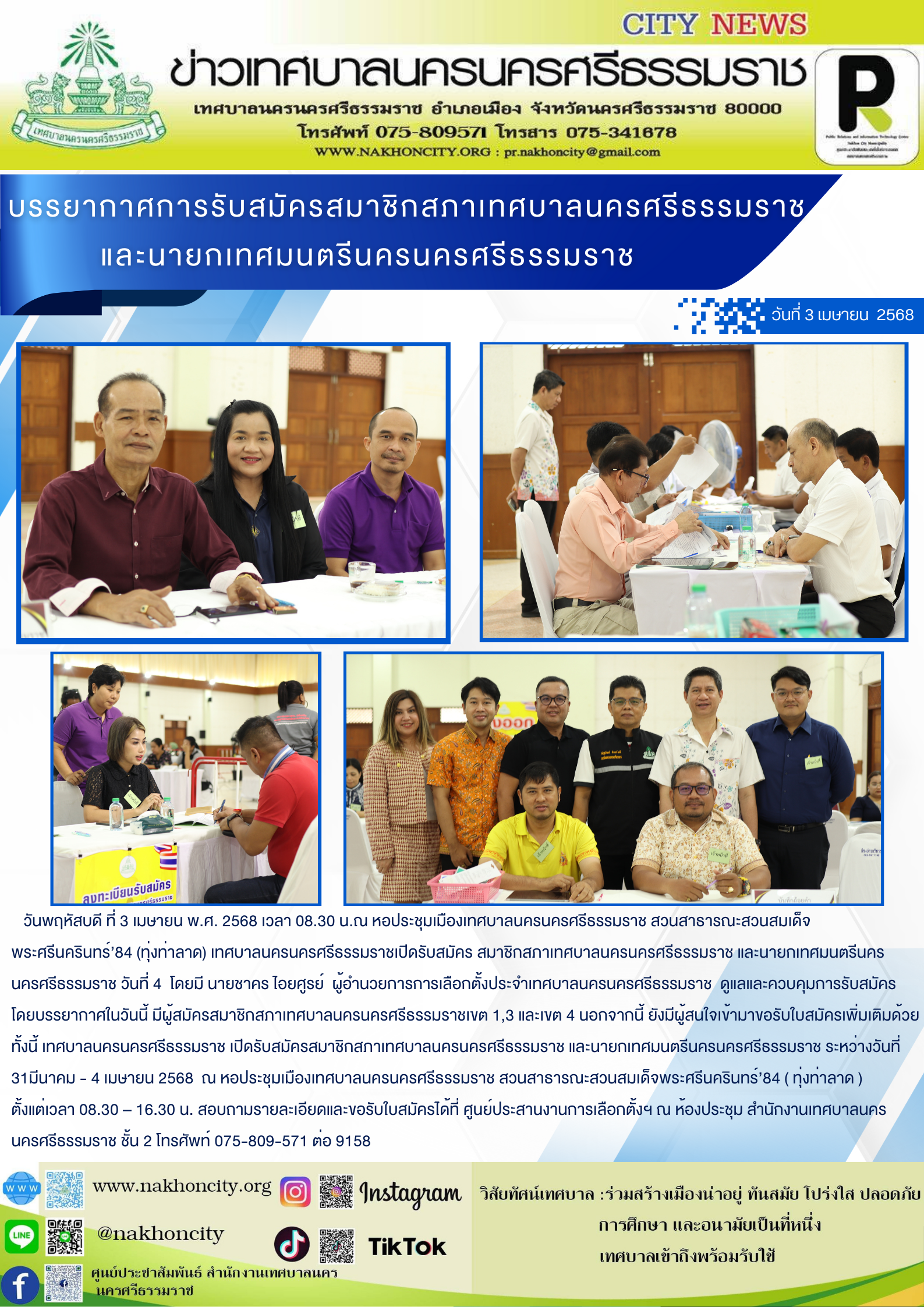 วันพฤหัสบดี ที่ 3 เมษายน พ.ศ. 2568 เวลา 08.30 น. ณ หอประชุมเมืองเทศบาลนครนครศรีธรรมราช สวนสาธารณะสวนสมเด็จพระศรีนครินทร์’84 ( ทุ่งท่าลาด ) เทศบาลนครนครศรีธรรมราชเปิดรับสมัคร สมาชิกสภาเทศบาลนครนครศรีธรรมราช และนายกเทศมนตรีนครนครศรีธรรมราช วันที่ 4 โดยมีนายชาคร ไอยศูรย์ ผู้อำนวยการการเลือกตั้งประจำเทศบาลนครนครศรีธรรมราช ดูแลและควบคุมการรับสมัคร โดยบรรยากาศในวันนี้ มีผู้สมัครสมาชิกสภาเทศบาลนครนครศรีธรรมราชเขต 1,3 และเขต 4 นอกจากนี้ ยังมีผู้สนใจเข้ามาขอรับใบสมัครเพิ่มเติมด้วย ทั้งนี้ เทศบาลนครนครศรีธรรมราช เปิดรับสมัครสมาชิกสภาเทศบาลนครนครศรีธรรมราช และนายกเทศมนตรีนครนครศรีธรรมราช ระหว่างวันที่ 31มีนาคม - 4 เมษายน 2568 ณ หอประชุมเมืองเทศบาลนครนครศรีธรรมราช สวนสาธารณะสวนสมเด็จพระศรีนครินทร์’84 ( ทุ่งท่าลาด ) ตั้งแต่เวลา 08.30 – 16.30 น. สอบถามรายละเอียดและขอรับใบสมัครได้ที่ ศูนย์ประสานงานการเลือกตั้งฯ ณ ห้องประชุม สำนักงานเทศบาลนครนครศรีธรรมราช ชั้น 2 โทรศัพท์ 075-809-571 ต่อ 9158
