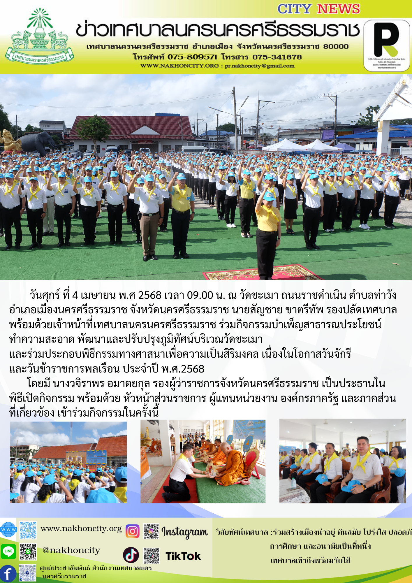วันศุกร์ ที่ 4 เมษายน พ.ศ 2568 เวลา 09.00 น. ณ วัดชะเมา ถนนราชดำเนิน ตำบลท่าวัง อำเภอเมืองนครศรีธรรมราช จังหวัดนครศรีธรรมราช นายสัญชาย ชาตรีทัพ รองปลัดเทศบาล พร้อมด้วยเจ้าหน้าที่เทศบาลนครนครศรีธรรมราช ร่วมกิจกรรมบำเพ็ญสาธารณประโยชน์ทำความสะอาด พัฒนาและปรับปรุงภูมิทัศน์บริเวณวัดชะเมา และร่วมประกอบพิธีกรรมทางศาสนาเพื่อความเป็นสิริมงคล เนื่องในโอกาสวันจักรี และวันข้าราชการพลเรือน ประจำปี พ.ศ.2568 โดยมี นางวจิราพร อมาตยกุล รองผู้ว่าราชการจังหวัดนครศรีธรรมราช เป็นประธานในพิธีเปิดกิจกรรม หัวหน้าส่วนราชการ ผู้แทนหน่วยงาน องค์กรภาครัฐ และภาคส่วนที่เกี่ยวข้อง เข้าร่วมกิจกรรมในครั้งนี้ |