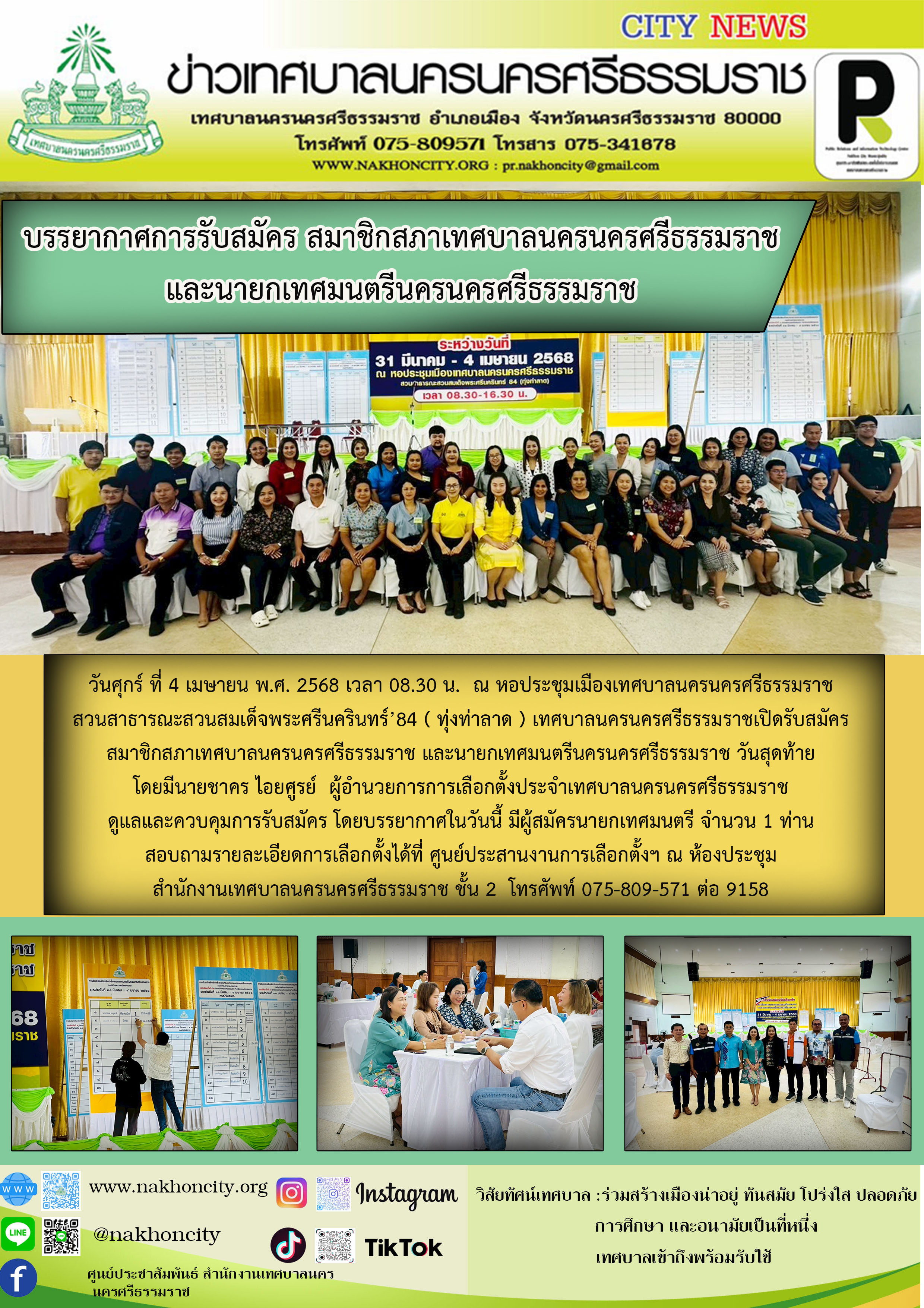 วันศุกร์ ที่ 4 เมษายน พ.ศ. 2568 เวลา 08.30 น. ณ หอประชุมเมืองเทศบาลนครนครศรีธรรมราช สวนสาธารณะสวนสมเด็จพระศรีนครินทร์’84 ( ทุ่งท่าลาด ) เทศบาลนครนครศรีธรรมราชเปิดรับสมัคร สมาชิกสภาเทศบาลนครนครศรีธรรมราช และนายกเทศมนตรีนครนครศรีธรรมราช วันสุดท้าย โดยมีนายชาคร ไอยศูรย์ ผู้อำนวยการการเลือกตั้งประจำเทศบาลนครนครศรีธรรมราช ดูแลและควบคุมการรับสมัคร โดยบรรยากาศในวันนี้ มีผู้สมัครนายกเทศมนตรี จำนวน 1 ท่าน สอบถามรายละเอียดการเลือกตั้งได้ที่ ศูนย์ประสานงานการเลือกตั้งฯ ณ ห้องประชุม สำนักงานเทศบาลนครนครศรีธรรมราช ชั้น 2 โทรศัพท์ 075-809-571 ต่อ 9158 ภาพ//ข่าว//ไกรสิทธิ |