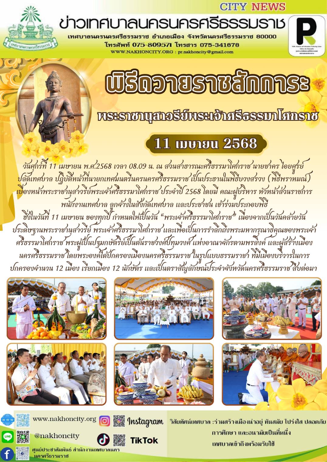 วันศุกร์ที่ 11 เมษายน พ.ศ.2568 เวลา 08.09 น. ณ สวนสาธารณะศรีธรรมาโศกราช นายชาคร ไอยศูรย์ ปลัดเทศบาล ปฏิบัติหน้าที่นายกเทศมนตรีนครนครศรีธรรมราช เป็นประธานในพิธีบวงสรวง (พิธีพราหมณ์) เบื้องหน้าพระราชานุสาวรีย์พระเจ้าศรีธรรมาโศกราช ประจำปี 2568 โดยมี คณะผู้บริหาร หัวหน้าส่วนราชการ พนักงานเทศบาล ลูกจ้างในสังกัดเทศบาล และประชาชน เข้าร่วมประกอบพิธี ซึ่งในวันที่ 11 เมษายน ของทุกปี กำหนดให้เป็นวัน “พระเจ้าศรีธรรมาโศกราช” เนื่องจากเป็นวันคล้ายวันประดิษฐานพระราชานุสาวรีย์ พระเจ้าศรีธรรมาโศกราช และเพื่อเป็นการรำลึกถึงพระมหากรุณาธิคุณของพระเจ้าศรีธรรมาโศกราช พระผู้เป็นปฐมกษัตริย์เป็นต้นราชวงศ์ปทุมวงศ์ แห่งอาณาจักรตามพรลิงค์ และผู้สร้างเมืองนครศรีธรรมราช โดยพระองค์ได้ปกครองเมืองนครศรีธรรมราช ในรูปแบบธรรมราชา ที่มีเมืองบริวารในการปกครองจำนวน 12 เมือง เรียกเมือง 12 นักษัตร และเป็นตราสัญลักษณ์ประจำจังหวัดนครศรีธรรมราช สืบต่อมา .................. ภาพ//ข่าว//จันทร์จิรา ตรวจทาน//ฐิตินันท์