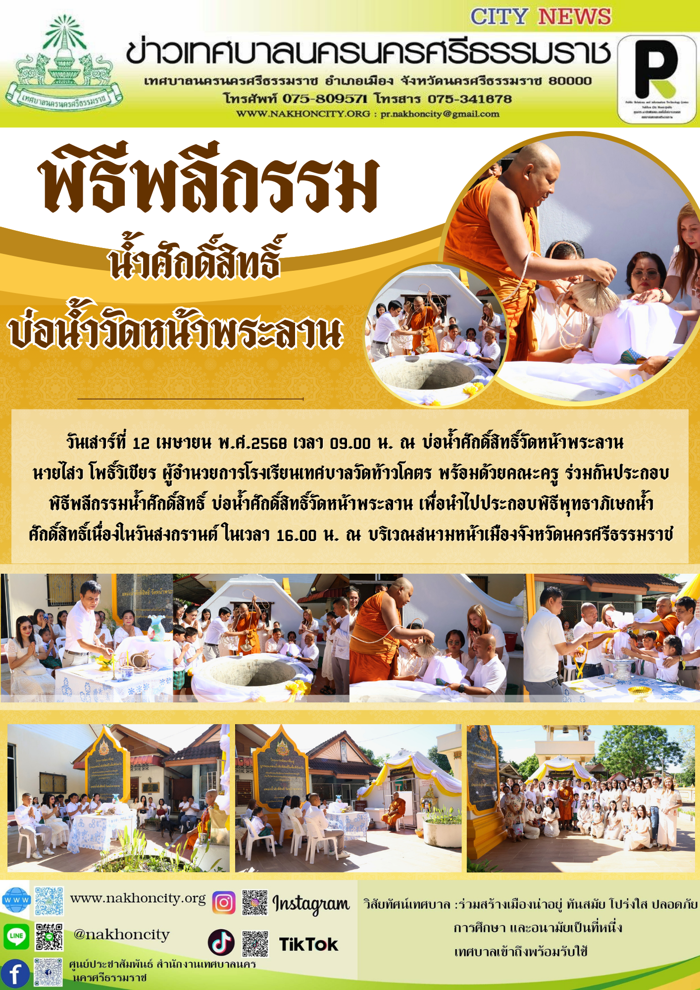 วันเสาร์ที่ 12 เมษายน พ.ศ.2568 เวลา 09.00 น. ณ บ่อน้ำศักดิ์สิทธิ์วัดหน้าพระลาน นายไสว โพธิ์วิเชียร ผู้อำนวยการโรงเรียนเทศบาลวัดท้าวโคตร พร้อมด้วยคณะครู ร่วมกันประกอบพิธีพลีกรรมน้ำศักดิ์สิทธิ์ บ่อน้ำศักดิ์สิทธิ์วัดหน้าพระลาน เพื่อนำไปประกอบพิธีพุทธาภิเษกน้ำศักดิ์สิทธิ์เนื่องในวันสงกรานต์ ในเวลา 16.00 น. ณ บริเวณสนามหน้าเมืองจังหวัดนครศรีธรรมราช ................ ภาพ//ข่าว//จันทร์จิรา ตรวจทาน//ฐิตินันท์ |