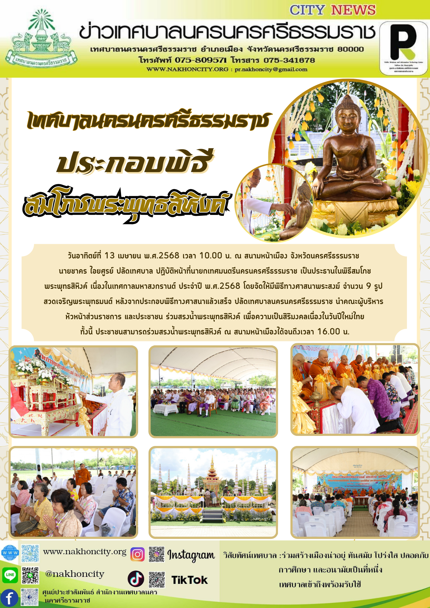 วันอาทิตย์ที่ 13 เมษายน พ.ศ.2568 เวลา 10.00 น. ณ สนามหน้าเมือง จังหวัดนครศรีธรรมราช นายชาคร ไอยศูรย์ ปลัดเทศบาล ปฏิบัติหน้าที่นายกเทศมนตรีนครนครศรีธรรมราช เป็นประธานในพิธีสมโภชพระพุทธสิหิงค์ เนื่องในเทศกาลมหาสงกรานต์ ประจำปี พ.ศ.2568 โดยจัดให้มีพิธีทางศาสนาพระสงฆ์ จำนวน 9 รูป สวดเจริญพระพุทธมนต์ หลังจากประกอบพิธีทางศาสนาแล้วเสร็จ ปลัดเทศบาลนครนครศรีธรรมราช นำคณะผู้บริหาร หัวหน้าส่วนราชการ และประชาชน ร่วมสรงน้ำพระพุทธสิหิงค์ เพื่อความเป็นสิริมงคลเนื่องในวันปีใหม่ไทย ทั้งนี้ ประชาชนสามารถร่วมสรงน้ำพระพุทธสิหิงค์ ณ สนามหน้าเมืองได้จนถึงเวลา 16.00 น. ............... ภาพ//ข่าว//จันทร์จิรา ตรวจทาน//ฐิตินันท์ |