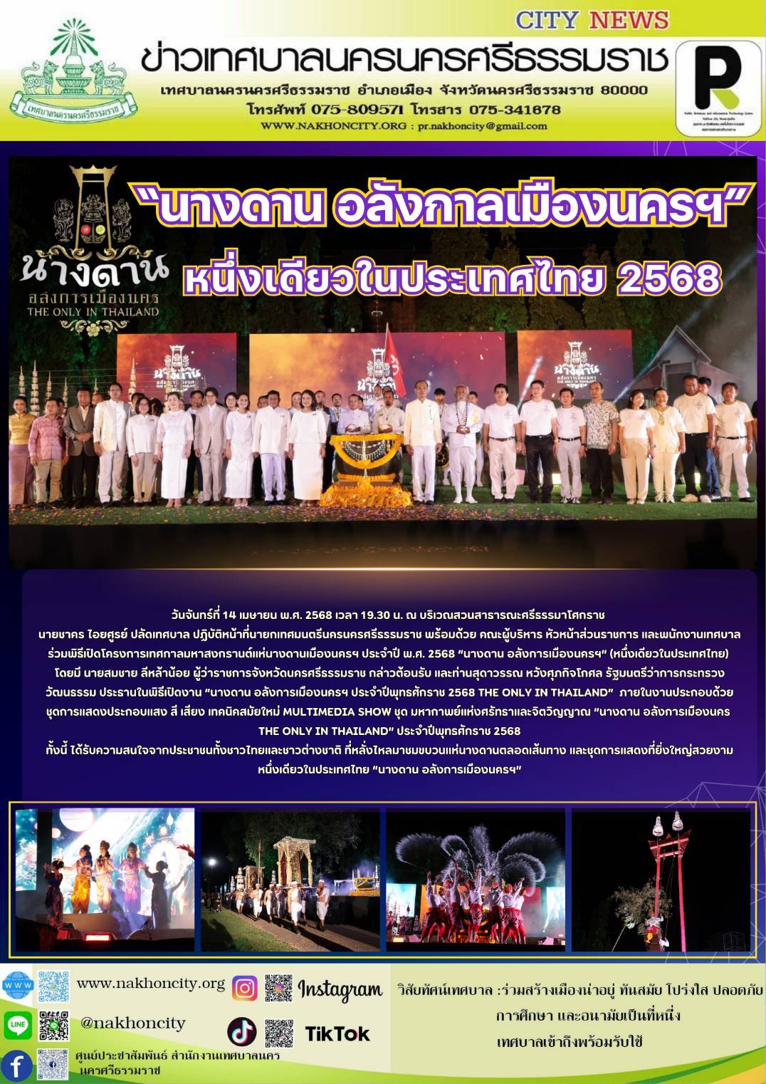 วันจันทร์ที่ 14 เมษายน พ.ศ. 2568 เวลา 19.30 น. ณ บริเวณสวนสาธารณะศรีธรรมาโศกราช นายชาคร ไอยศูรย์ ปลัดเทศบาล ปฏิบัติหน้าที่นายกเทศมนตรีนครนครศรีธรรมราช พร้อมด้วย คณะผู้บริหาร หัวหน้าส่วนราชการ และพนักงานเทศบาล ร่วมพิธีเปิดโครงการเทศกาลมหาสงกรานต์แห่นางดานเมืองนครฯ ประจำปี พ.ศ. 2568 “นางดาน อลังการเมืองนครฯ” (หนึ่งเดียวในประเทศ) โดยมี นายสมชาย ลีหล้าน้อย ผู้ว่าราชการจังหวัดนครศรีธรรมราช กล่าวต้อนรับ ประธานในพิธี นางโชติกา อัครกิจโสภากุล รองปลัดกระทรวงวัฒนธรรม ประธานในพิธีเปิดงาน “นางดาน อลังการเมืองนครฯ ประจำปีพุทธศักราช 2568 THE ONLY IN THAILAND” ภายในงานประกอบด้วยชุดการแสดงประกอบแสง สี เสียง เทคนิคสมัยใหม่ MULTIMEDIA SHOW ชุด มหากาพย์แห่งศรัทธาและจิตวิญญาณ “นางดาน อลังการเมืองนคร THE ONLY IN THAILAND” ประจำปีพุทธศักราช 2568 ทั้งนี้ ได้รับความสนใจจากประชาชนทั้งชาวไทยและชาวต่างชาติที่หลั่งไหลมาชมขบวนแห่นางดานตลอดเส้นทาง ถ.ราชดำเนิน จากบริเวณหอพระอิศวรมายังสวนสาธารณะศรีธรรมาโศกราช และชมชุดการแสดงที่ยิ่งใหญ่สวยงามตระการตาหนึ่งเดียวในประเทศ “นางดาน อลังการเมืองนครฯ” .................... ภาพ//ข่าว//จันทร์จิรา ตรวจทาน//ฐิตินันท์ |