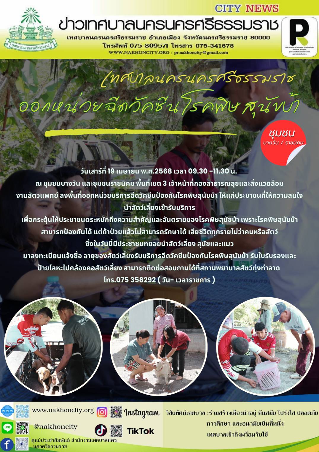 วันเสาร์ ที่ 19 เมษายน พ.ศ.2568 เวลา 09.30 -11.30 น. ณ ชุมชนบางงัน และชุมชนราชนิคม เจ้าหน้าที่กองสาธารณสุขและสิ่งแวดล้อมงานสัตวแพทย์ ลงพื้นที่ออกหน่วยบริการฉีดวัคซีนป้องกันโรคพิษสุนัขบ้า ให้แก่ประชาชนที่ให้ความสนใจนำสัตว์เลี้ยงเข้ารับบริการ |