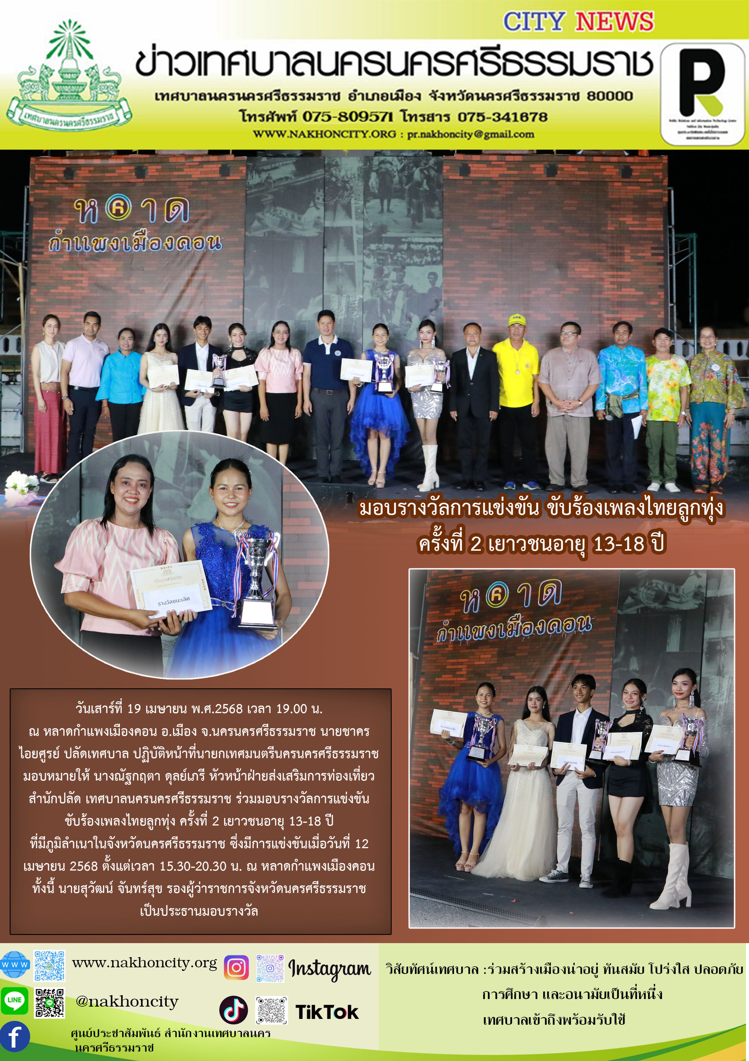วันเสาร์ที่ 19 เมษายน พ.ศ.2568 เวลา 19.00 น. ณ หลาดกำแพงเมืองคอน อ.เมือง จ.นครนครศรีธรรมราช นายชาคร ไอยศูรย์ ปลัดเทศบาล ปฏิบัติหน้าที่นายกเทศมนตรีนครนครศรีธรรมราช มอบหมายให้ นางณัฐกฤตา ดุลย์เภรี หัวหน้าฝ่ายส่งเสริมการท่องเที่ยว สำนักปลัด เทศบาลนครนครศรีธรรมราช ร่วมมอบรางวัลการแข่งขันขับร้องเพลงไทยลูกทุ่ง ครั้งที่ 2 เยาวชนอายุ 13-18 ปี ที่มีภูมิลำเนาในจังหวัดนครศรีธรรมราช ซึ่งมีการแข่งขันเมื่อวันที่ 12 เมษายน 2568 ตั้งแต่เวลา 15.30-20.30 น. ณ หลาดกำแพงเมืองคอน ทั้งนี้ นายสุวัฒน์ จันทร์สุข รองผู้ว่าราชการจังหวัดนครศรีธรรมราช เป็นประธานมอบรางวัล ภาพ//ข่าว//ไกรสิทธิ |