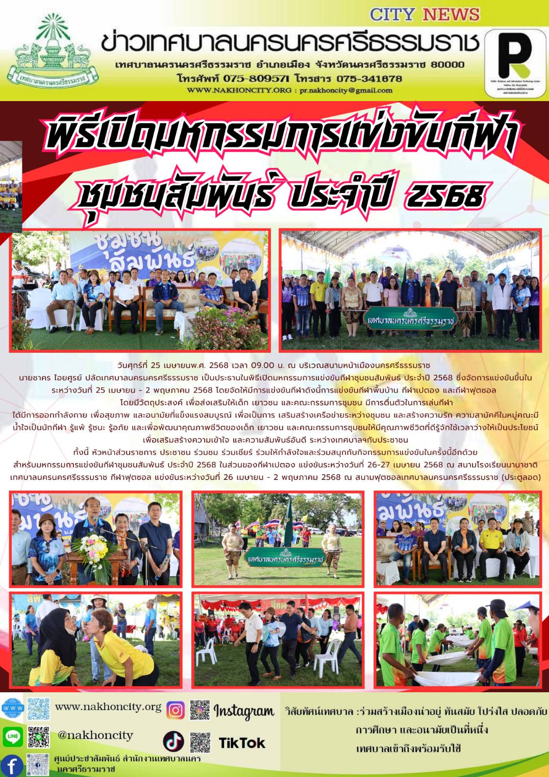 นายชาคร ไอยศูรย์ ปลัดเทศบาลนครนครศรีธรรมราช เป็นประธานในพิธีเปิดมหกรรมการแข่งขันกีฬาชุมชนสัมพันธ์ ประจำปี 2568 |