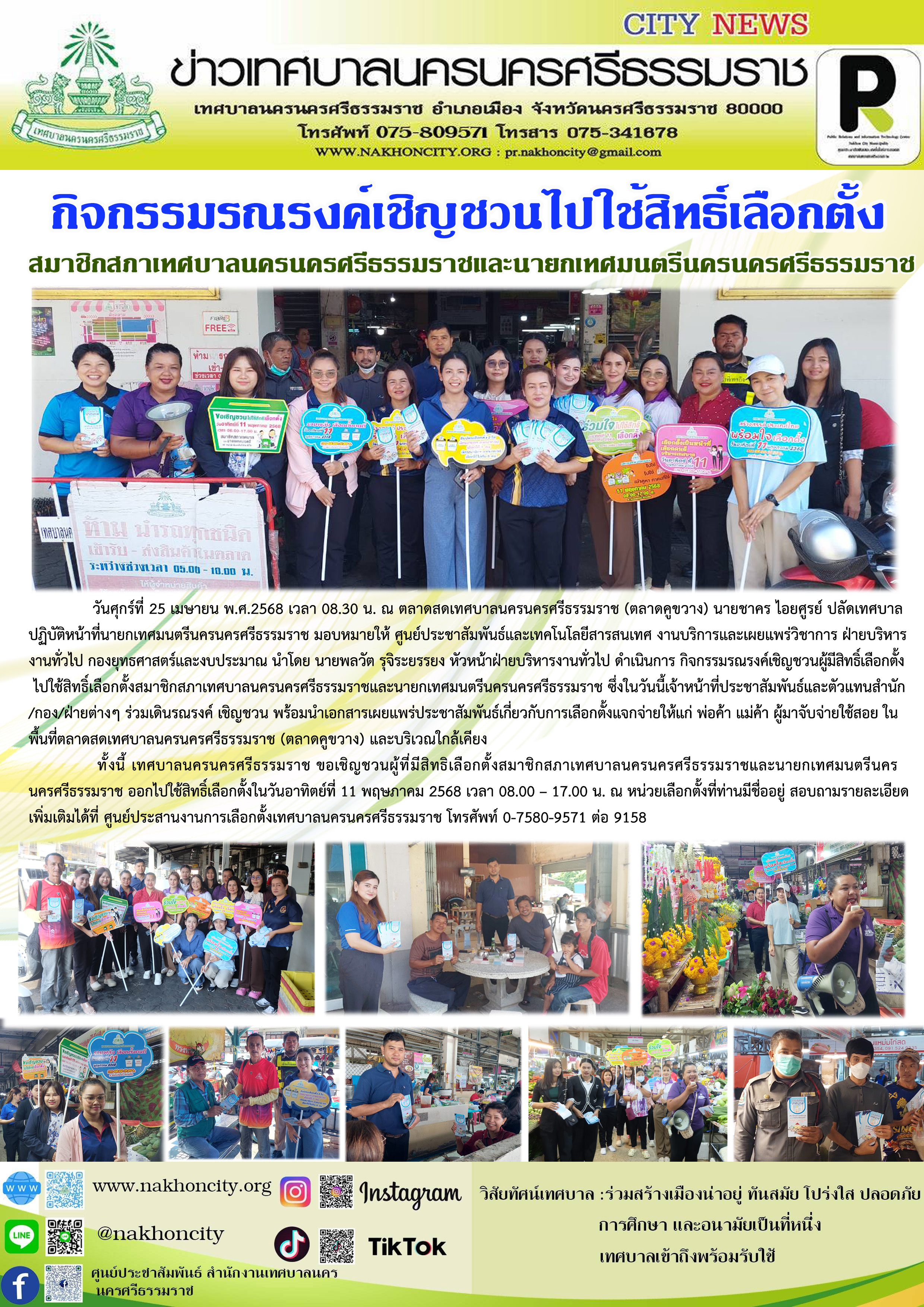 เทศบาลนครนครศรีธรรมราช ดำเนินกิจกรรมรณรงค์เชิญชวนผู้มีสิทธิ์เลือกตั้ง ไปใช้สิทธิ์เลือกตั้ง สมาชิกสภาเทศบาลนครนครศรีธรรมราชและนายกเทศมนตรีนครนครศรีธรรมราช |
