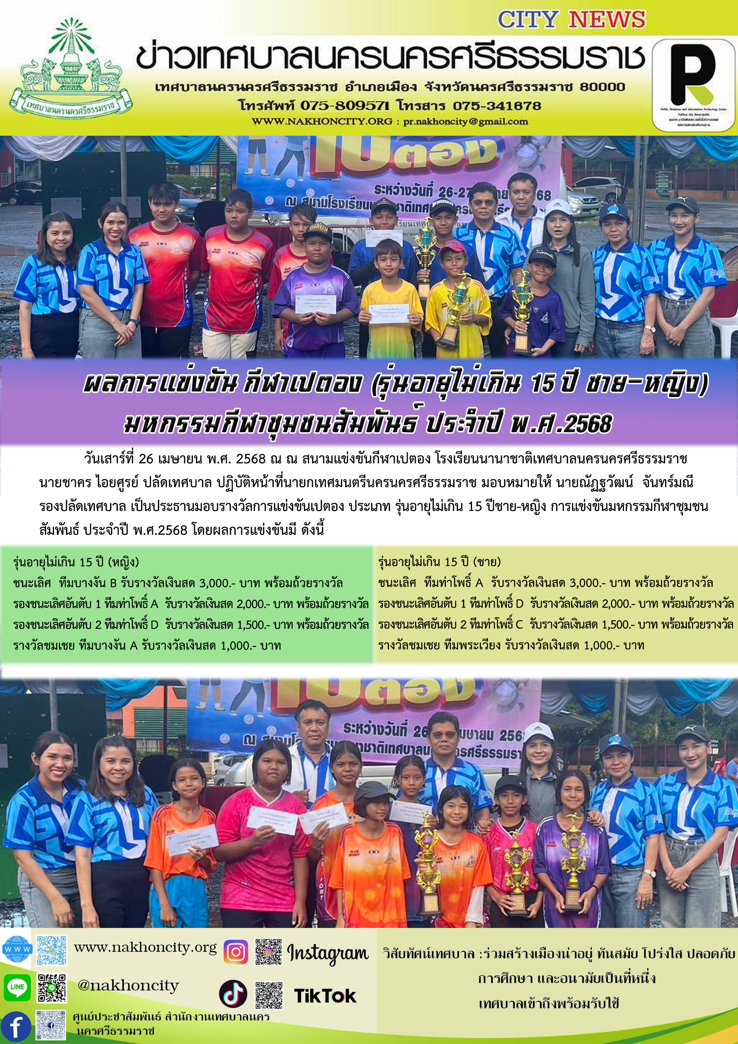 วันเสาร์ที่ 26 เมษายน พ.ศ. 2568 ณ ณ สนามแข่งขันกีฬาเปตอง โรงเรียนนานาชาติเทศบาลนครนครศรีธรรมราช นายชาคร ไอยศูรย์ ปลัดเทศบาล ปฏิบัติหน้าที่นายกเทศมนตรีนครนครศรีธรรมราช มอบหมายให้ นายณัฏฐวัฒน์ จันทร์มณี รองปลัดเทศบาล เป็นประธานมอบรางวัลการแข่งขันเปตอง ประเภท รุ่นอายุไม่เกิน 15 ปี ชาย-หญิง การแข่งขันมหกรรมกีฬาชุมชนสัมพันธ์ ประจำปี พ.ศ.2568 โดยผลการแข่งขันมี ดังนี้ รุ่นอายุไม่เกิน 15 ปี (หญิง) ชนะเลิศ ทีมบางงัน B รับรางวัลเงินสด 3,000.- บาท พร้อมถ้วยรางวัล รองชนะเลิศอันตับ 1 ทีมท่าโพธิ์ A รับรางวัลเงินสด 2,000.- บาท พร้อมถ้วยรางวัล รองชนะเลิศอันตับ 2 ทีมท่าโพธิ์ D รับรางวัลเงินสด 1,500.- บาท พร้อมถ้วยรางวัล รางวัลชมเชย ทีมบางงัน A รับรางวัลเงินสด 1,000.- บาท