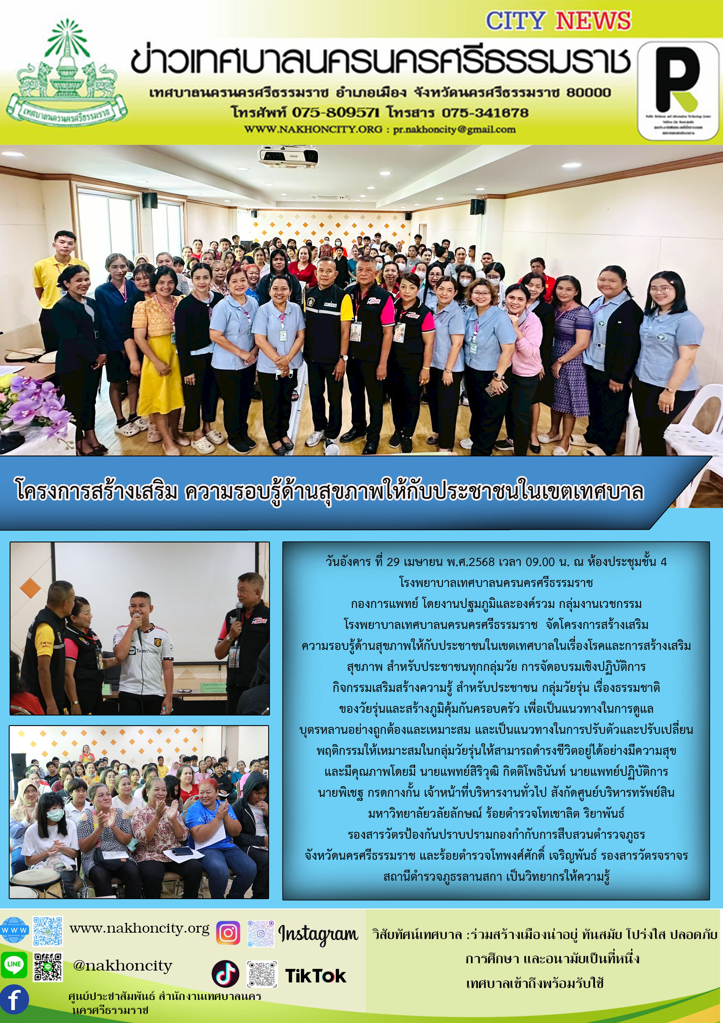 โรงพยาบาลเทศบาลนครนครศรีธรรมราช จัดโครงการสร้างเสริมความรอบรู้ด้านสุขภาพให้กับประชาชนในเขตเทศบาลในเรื่องโรคและการสร้างเสริมสุขภาพ สำหรับประชาชนทุกกลุ่มวัย |
