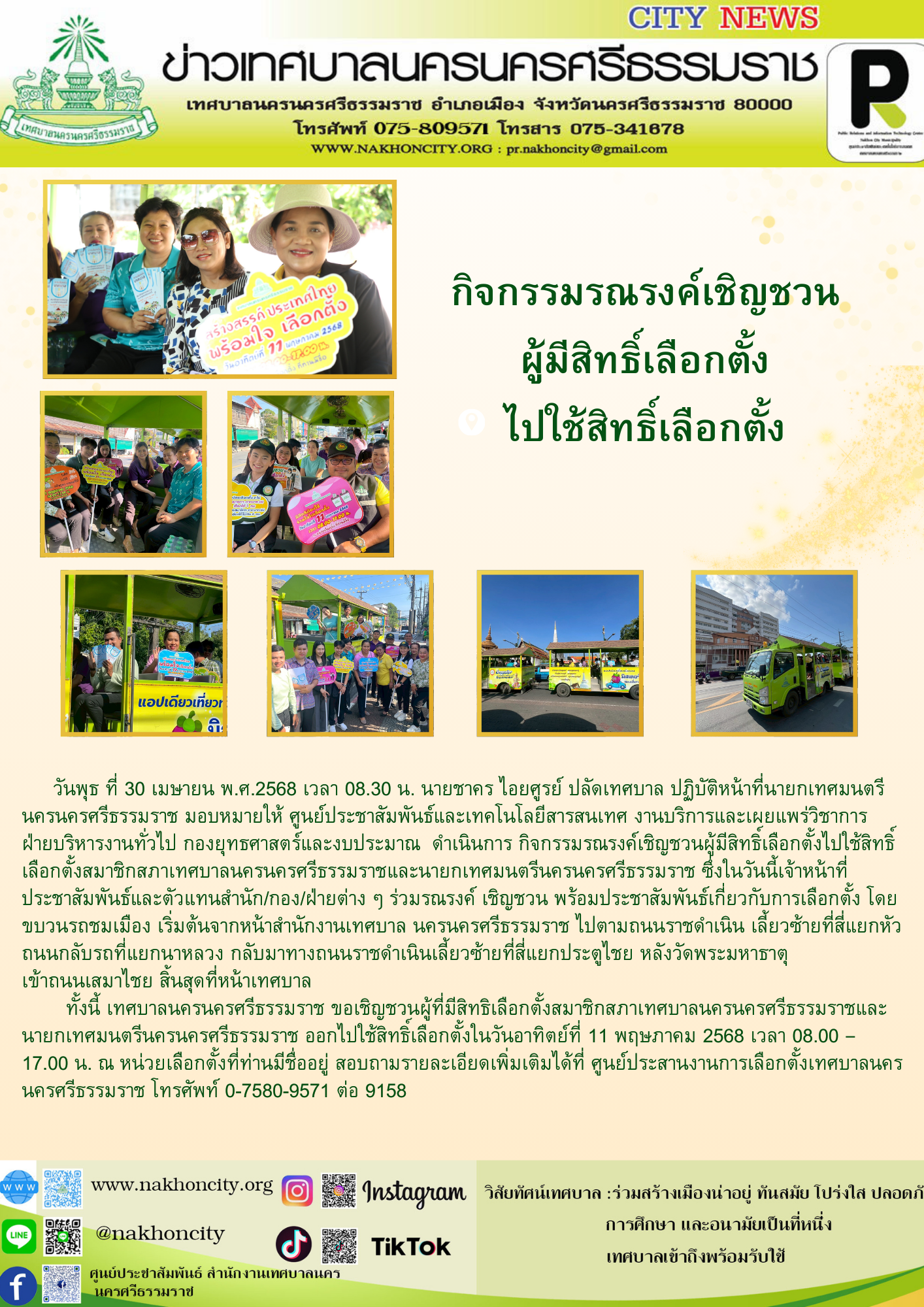 วันพุธ ที่ 30 เมษายน พ.ศ.2568 เวลา 08.30 น. นายชาคร ไอยศูรย์ ปลัดเทศบาล ปฏิบัติหน้าที่นายกเทศมนตรีนครนครศรีธรรมราช มอบหมายให้ ศูนย์ประชาสัมพันธ์และเทคโนโลยีสารสนเทศ งานบริการและเผยแพร่วิชาการ ฝ่ายบริหารงานทั่วไป กองยุทธศาสตร์และงบประมาณ ดำเนินการ กิจกรรมรณรงค์เชิญชวนผู้มีสิทธิ์เลือกตั้งไปใช้สิทธิ์เลือกตั้งสมาชิกสภาเทศบาลนครนครศรีธรรมราชและนายกเทศมนตรีนครนครศรีธรรมราช ซึ่งในวันนี้เจ้าหน้าที่ประชาสัมพันธ์และตัวแทนสำนัก/กอง/ฝ่ายต่าง ๆ ร่วมรณรงค์ เชิญชวน พร้อมประชาสัมพันธ์เกี่ยวกับการเลือกตั้ง โดยขบวนรถชมเมือง เริ่มต้นจากหน้าสำนักงานเทศบาล นครนครศรีธรรมราช ไปตามถนนราชดำเนิน เลี้ยวซ้ายที่สี่แยกหัวถนน กลับรถที่แยกนาหลวง กลับมาทางถนนราชดำเนิน เลี้ยวซ้ายที่สี่แยกประตูไชย หลังวัดพระมหาธาตุ เข้าถนนเสมาไชย สิ้นสุดที่หน้าเทศบาล ทั้งนี้ เทศบาลนครนครศรีธรรมราช ขอเชิญชวนผู้ที่มีสิทธิเลือกตั้งสมาชิกสภาเทศบาลนครนครศรีธรรมราชและนายกเทศมนตรีนครนครศรีธรรมราช ออกไปใช้สิทธิ์เลือกตั้งในวันอาทิตย์ที่ 11 พฤษภาคม 2568 เวลา 08.00 – 17.00 น. ณ หน่วยเลือกตั้งที่ท่านมีชื่ออยู่ สอบถามรายละเอียดเพิ่มเติมได้ที่ ศูนย์ประสานงานการเลือกตั้งเทศบาลนครนครศรีธรรมราช โทรศัพท์ 0-7580-9571 ต่อ 9158 |