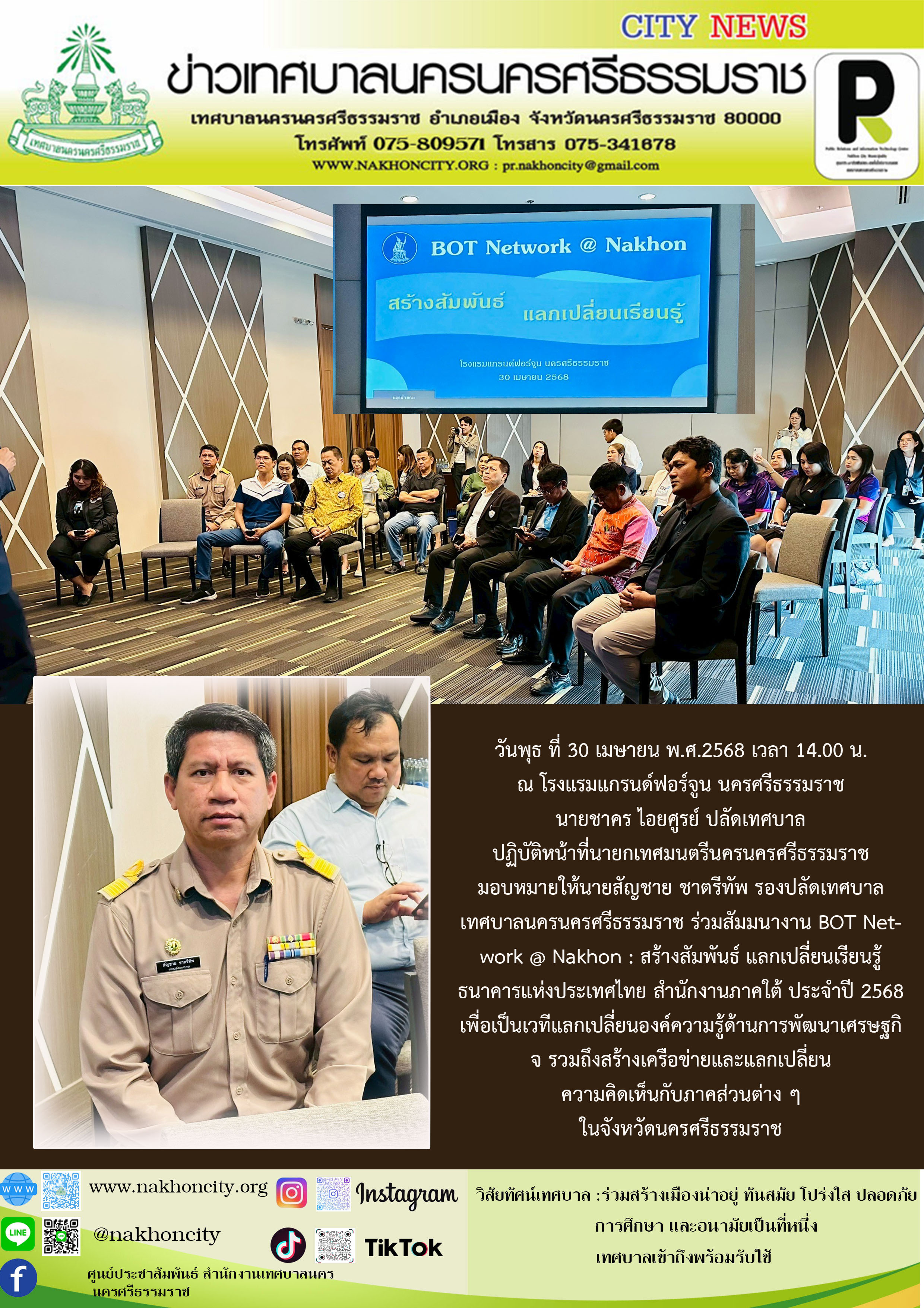 เทศบาลนครนครศรีธรรมราช ร่วมสัมมนางาน BOT Network @ Nakhon : สร้างสัมพันธ์ แลกเปลี่ยนเรียนรู้ ธนาคารแห่งประเทศไทย สำนักงานภาคใต้ ประจำปี 2568 |