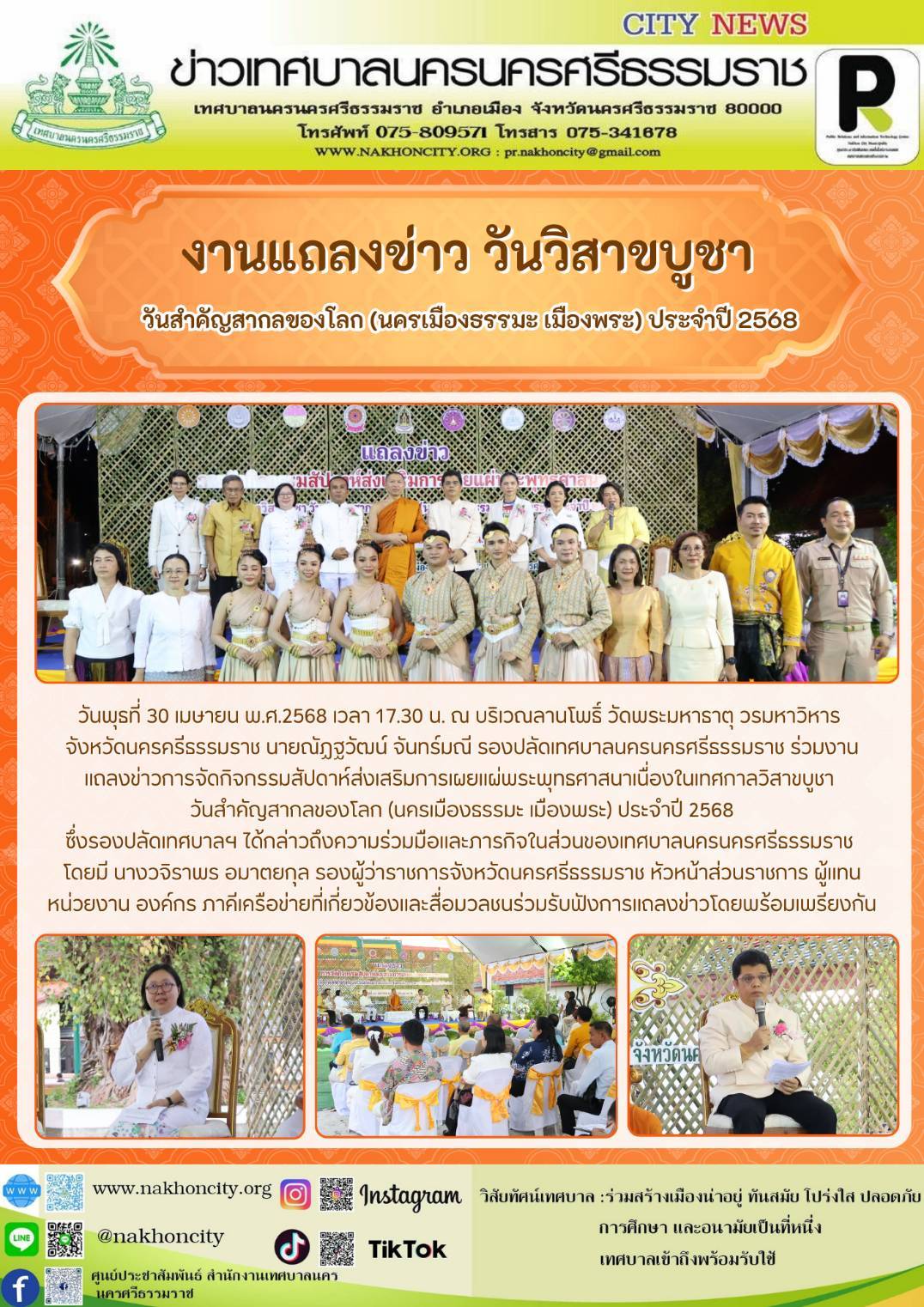 วันพุธที่ 30 เมษายน พ.ศ.2568 เวลา 17.30 น. ณ บริเวณลานโพธิ์ วัดพระมหาธาตุ วรมหาวิหาร จังหวัดนครครีธรรมราช นายณัฏฐวัฒน์ จันทร์มณี รองปลัดเทศบาลนครนครศรีธรรมราช ร่วมงานแถลงข่าวการจัดกิจกรรมสัปดาห์ส่งเสริมการเผยแผ่พระพุทธศาสนาเนื่องในเทศกาลวิสาขบูชา วันสำคัญสากลของโลก (นครเมืองธรรมะ เมืองพระ) ประจำปี 2568 |