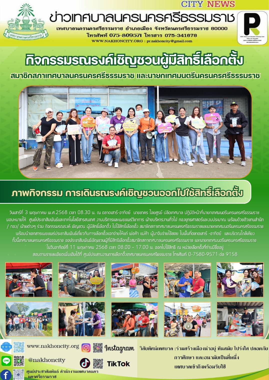 เทศบาลนครนครศรีธรรมราช ดำเนินการ กิจกรรมรณรงค์เชิญชวนผู้มีสิทธิ์เลือกตั้ง ไปใช้สิทธิ์เลือกตั้ง สมาชิกสภาเทศบาลนครนครศรีธรรมราชและนายกเทศมนตรีนครนครศรีธรรมราช ณ ตลาดเสาร์ -อาทิตย์ |