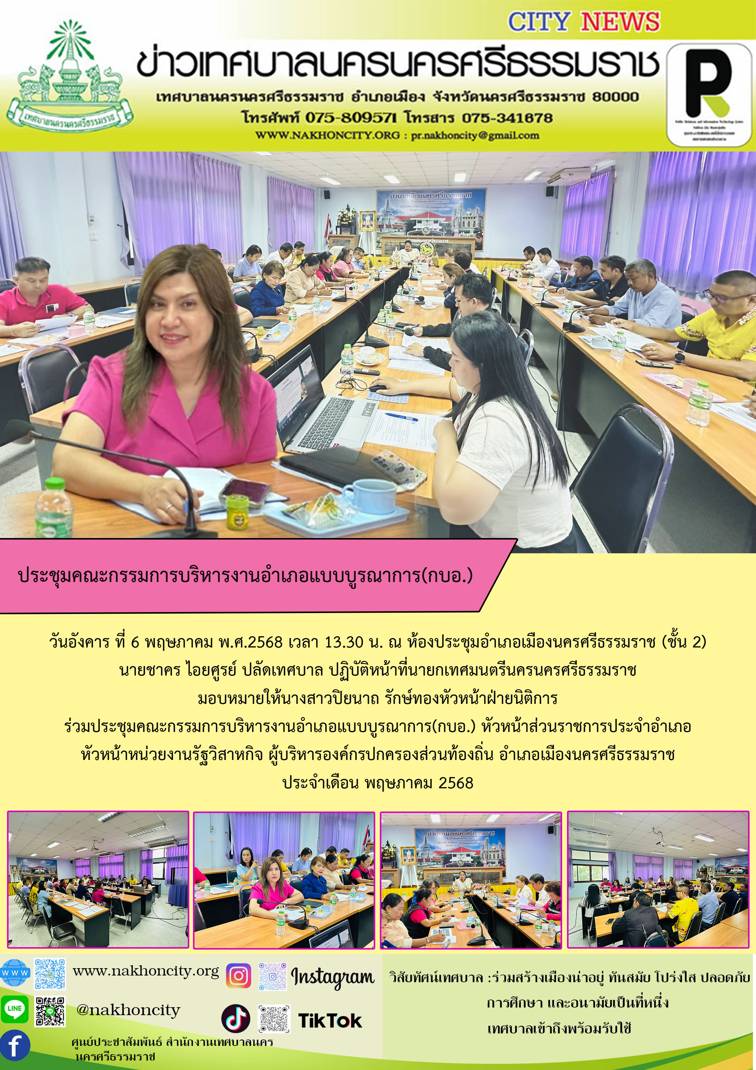 เทศมนตรีนครนครศรีธรรมราช ร่วมประชุมคณะกรรมการบริหารงานอำเภอแบบบูรณาการ(กบอ.) หัวหน้าส่วนราชการประจำอำเภอ หัวหน้าหน่วยงานรัฐวิสาหกิจ ผู้บริหารองค์กรปกครองส่วนท้องถิ่น อำเภอเมืองนครศรีธรรมราช ประจำเดือน พฤษภาคม 2568 |