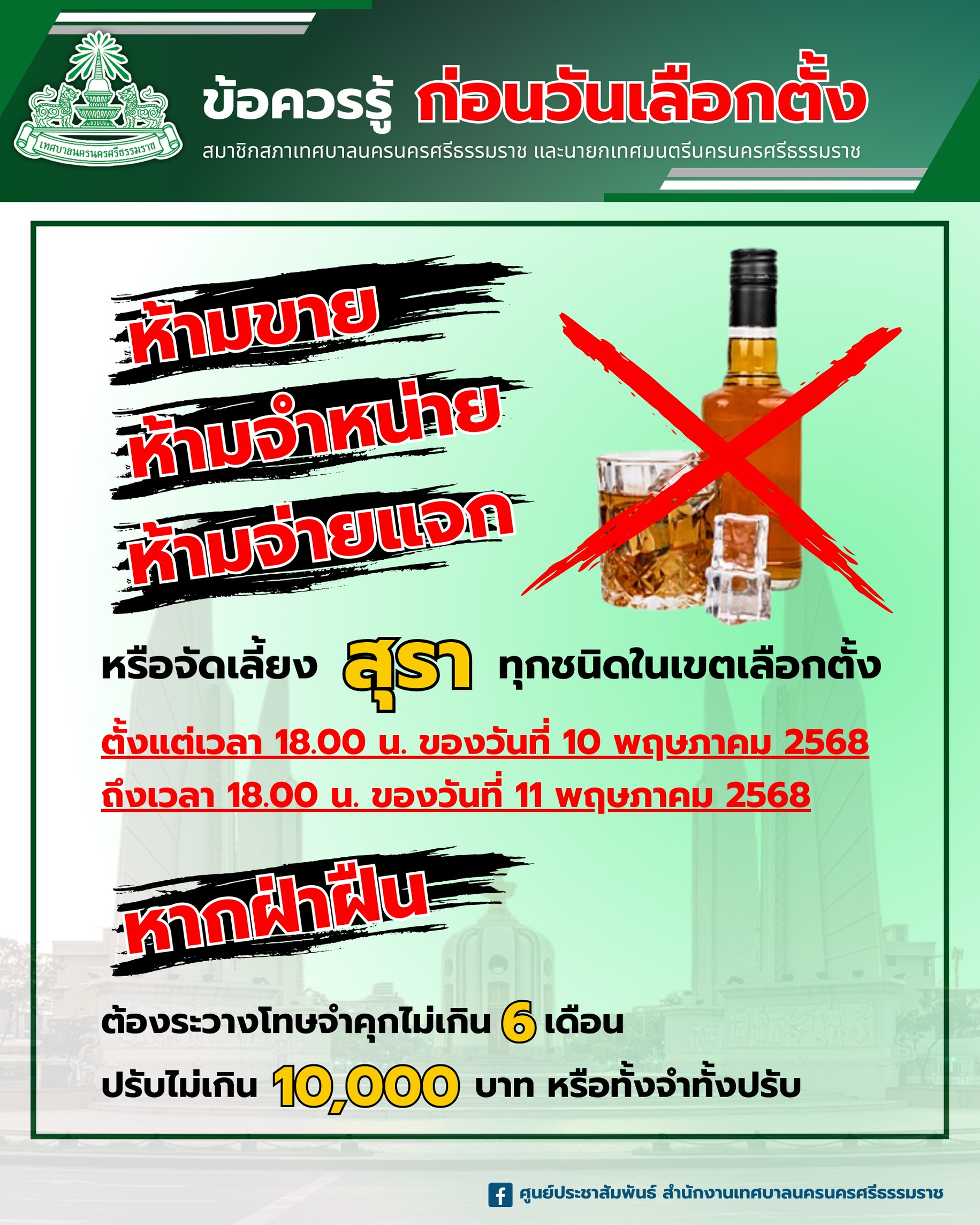 ห้ามจำหน่าย !!!! เครื่องดื่มแอลกอฮอล์ก่อนวันเลือกตั้ง ห้ามขาย ห้ามจำหน่าย ห้ามจ่ายแจก ตั้งแต่วันที่ 10 พฤษภาคม 2568 เวลา 18.00 น. ถึงวันที่ 11 พฤษภาคม 2568(วันเลือกตั้ง) เวลา 18.00 น ฝ่าฝืนจำคุกไม่เกิน 6 เดือน หรือปรับไม่เกิน 10,000 บาท หรือทั้งจำทั้งปรับ |