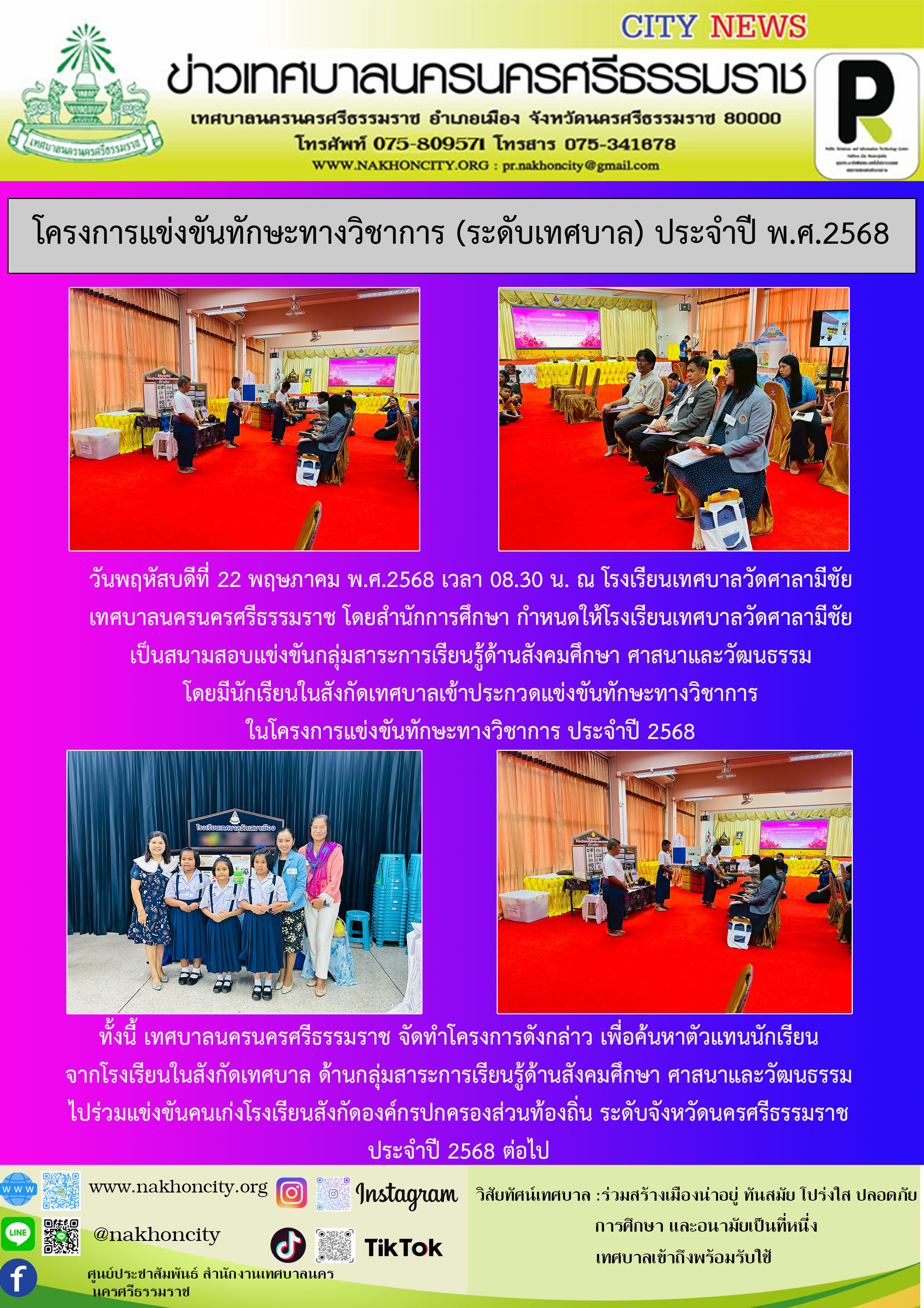 วันพฤหัสบดีที่ 22 พฤษภาคม พ.ศ.2568 เวลา 08.30 น. ณ โรงเรียนเทศบาลวัดศาลามีชัย เทศบาลนครนครศรีธรรมราช โดยสำนักการศึกษา กำหนดให้โรงเรียนเทศบาลวัดศาลามีชัย เป็นสนามสอบแข่งขันกลุ่มสาระการเรียนรู้ด้านสังคมศึกษา ศาสนาและวัฒนธรรม โดยมีนักเรียนในสังกัดเทศบาลเข้าประกวดแข่งขันทักษะทางวิชาการ ในโครงการแข่งขันทักษะทางวิชาการ ประจำปี 2568