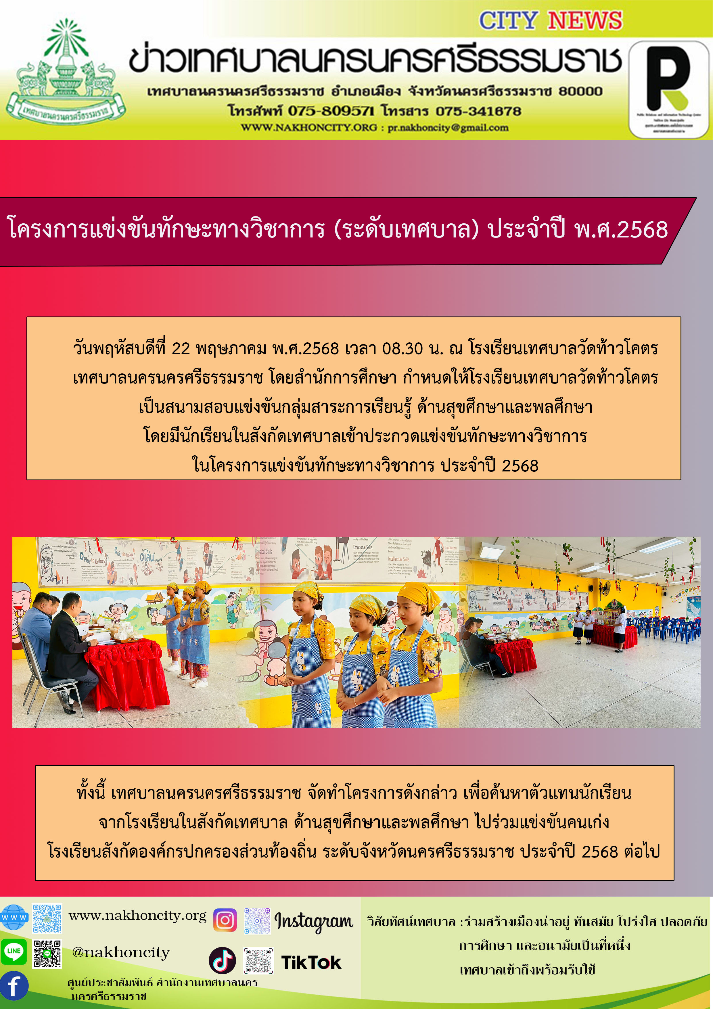 วันพฤหัสบดีที่ 22 พฤษภาคม พ.ศ.2568 เวลา 08.30 น. ณ โรงเรียนเทศบาลวัดท้าวโคตร เทศบาลนครนครศรีธรรมราช โดยสำนักการศึกษา กำหนดให้โรงเรียนเทศบาลวัดท้าวโคตร เป็นสนามสอบแข่งขันกลุ่มสาระการเรียนรู้ ด้านสุขศึกษาและพลศึกษา โดยมีนักเรียนในสังกัดเทศบาลเข้าประกวดแข่งขันทักษะทางวิชาการ ในโครงการแข่งขันทักษะทางวิชาการ ประจำปี 2568