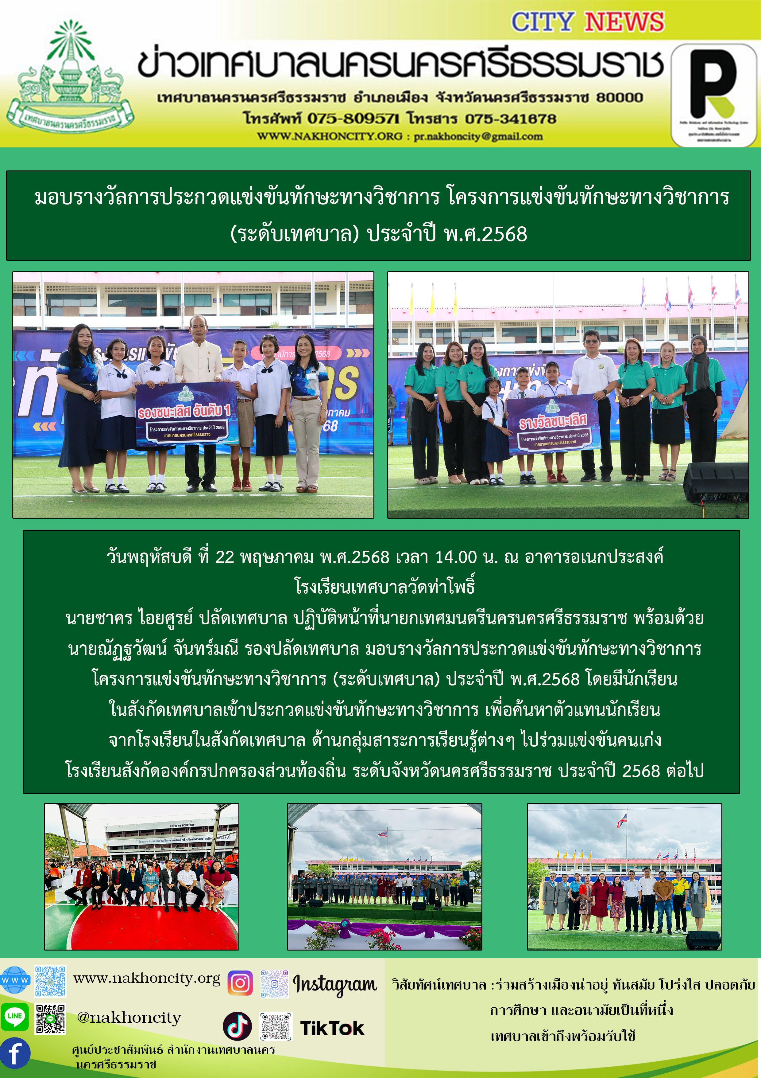 นายชาคร ไอยศูรย์ ปลัดเทศบาล ปฏิบัติหน้าที่นายกเทศมนตรีนครนครศรีธรรมราช พร้อมด้วย นายณัฏฐวัฒน์ จันทร์มณี รองปลัดเทศบาล มอบรางวัลการประกวดแข่งขันทักษะทางวิชาการ โครงการแข่งขันทักษะทางวิชาการ (ระดับเทศบาล) ประจำปี พ.ศ.2568 |