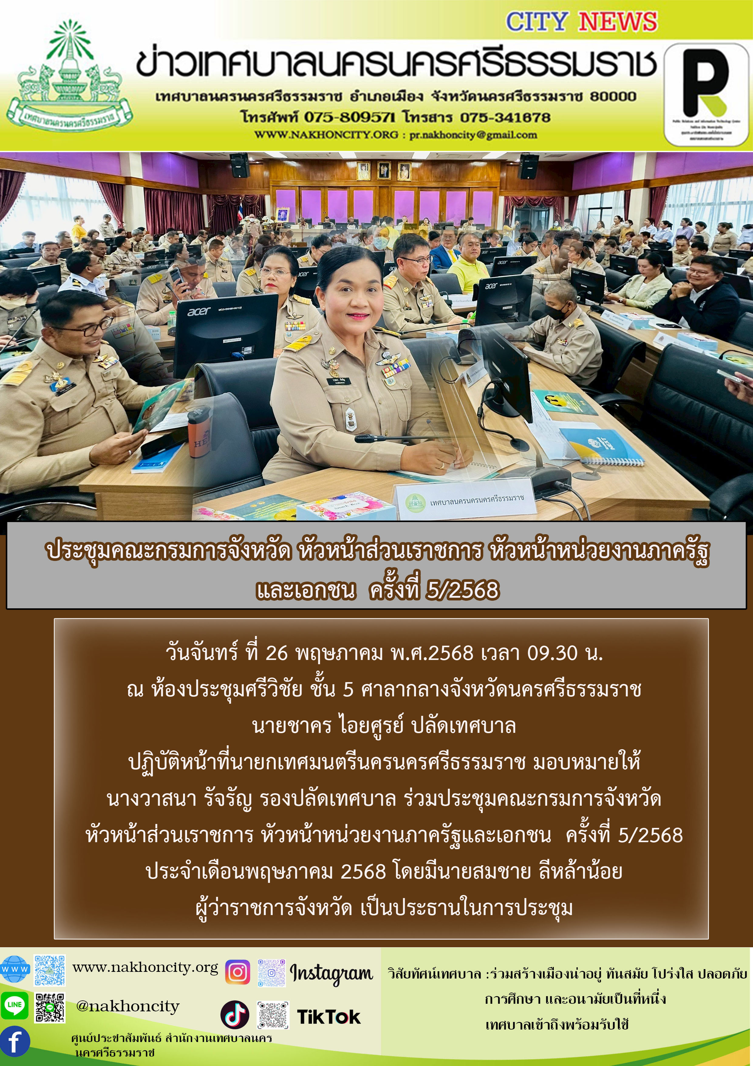วันจันทร์ ที่ 26 พฤษภาคม พ.ศ.2568 เวลา 09.30 น. ณ ห้องประชุมศรีวิชัย ชั้น 5 ศาลากลางจังหวัดนครศรีธรรมราช ภาพ//ข่าว//ไกรสิทธิ |