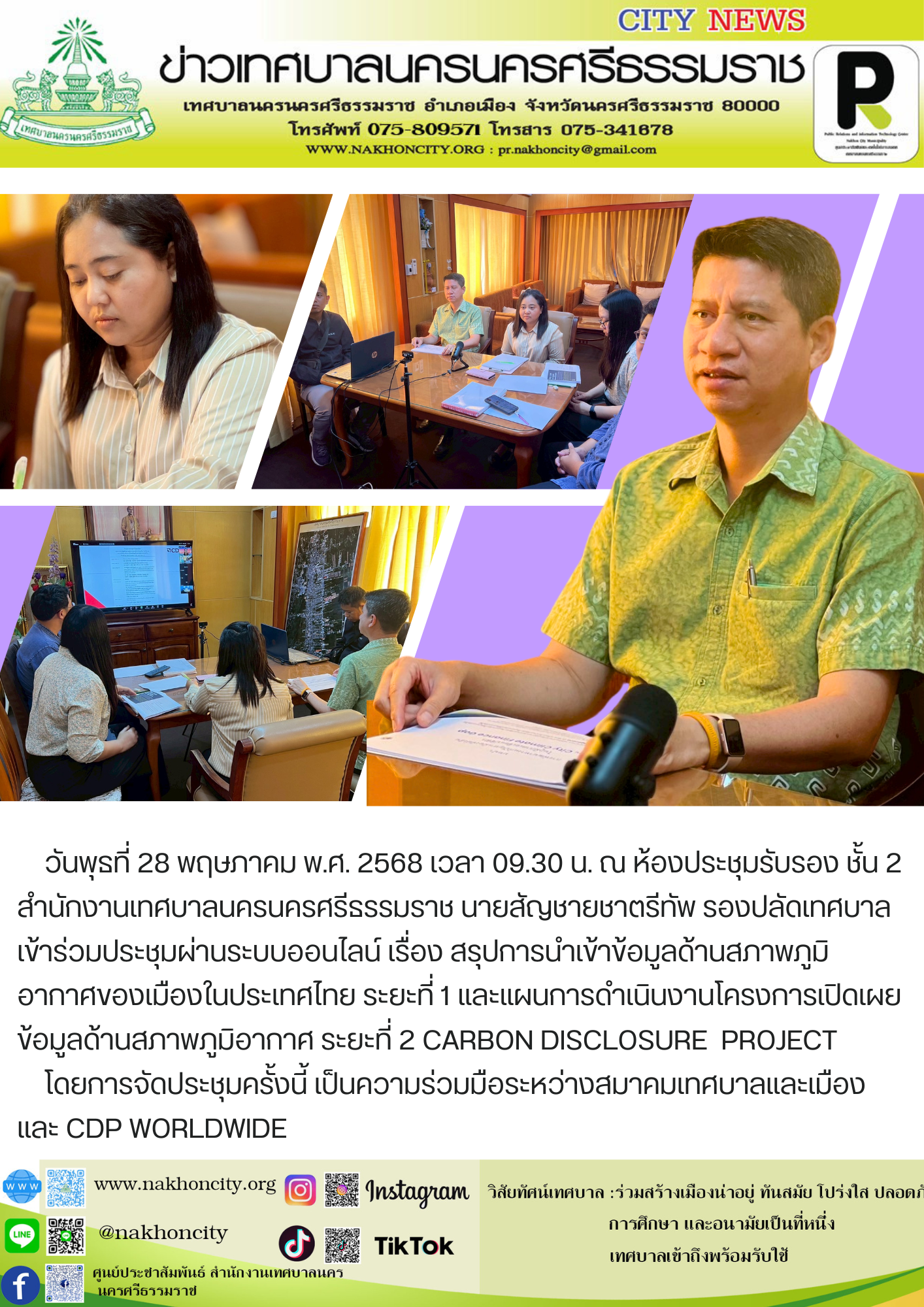วันพุธที่ 28 พฤษภาคม พ.ศ. 2568 เวลา 09.30 น. ณ ห้องประชุมรับรอง ชั้น 2 สำนักงานเทศบาลนครนครศรีธรรมราช นายสัญชาย ชาตรีทัพ รองปลัดเทศบาล เข้าร่วมประชุมผ่านระบบออนไลน์ เรื่อง สรุปการนำเข้าข้อมูลด้านสภาพภูมิอากาศของเมืองในประเทศไทย ระยะที่ 1 และแผนการดำเนินงานโครงการเปิดเผยข้อมูลด้านสภาพภูมิอากาศ ระยะที่ 2 Carbon Disclosure Project โดยการจัดประชุมครั้งนี้ เป็นความร่วมมือระหว่างสมาคมเทศบาลและเมือง และ CDP worldwide |
