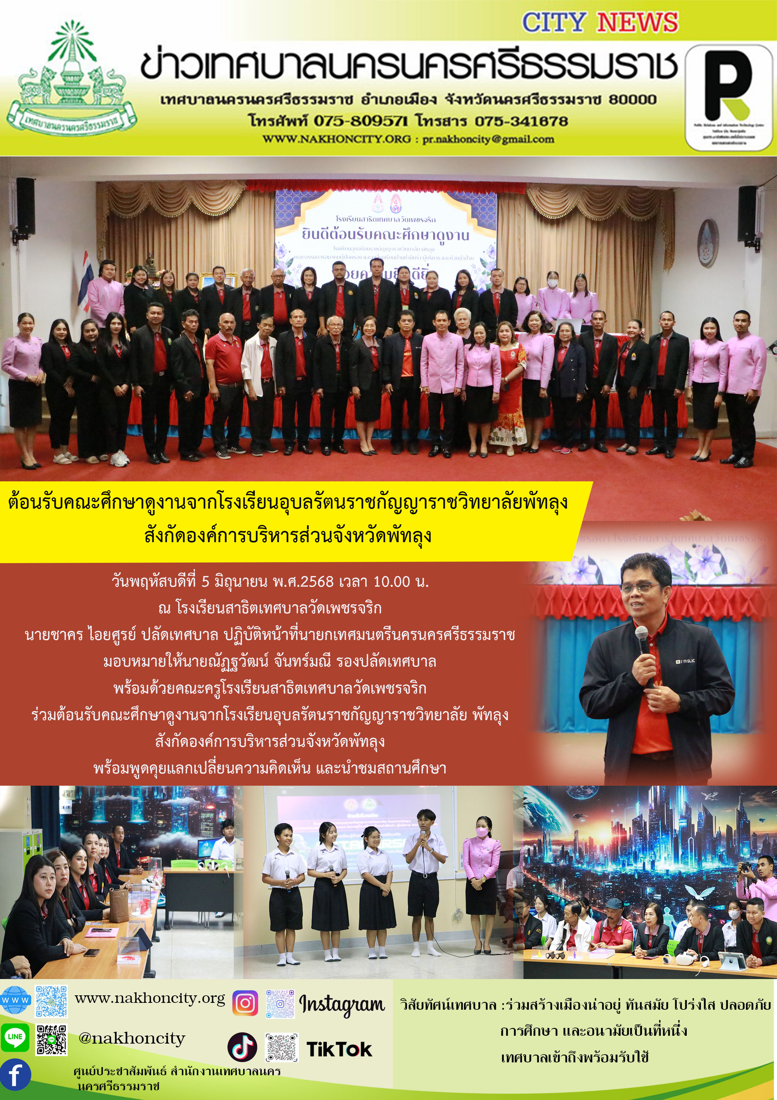 วันพฤหัสบดีที่ 5 มิถุนายน พ.ศ.2568 เวลา 10.00 น. ณ โรงเรียนสาธิตเทศบาลวัดเพชรจริก นายชาคร ไอยศูรย์ ปลัดเทศบาล ปฏิบัติหน้าที่นายกเทศมนตรีนครนครศรีธรรมราช มอบหมายให้นายณัฏฐวัฒน์ จันทร์มณี รองปลัดเทศบาล พร้อมด้วยคณะครูโรงเรียนสาธิตเทศบาลวัดเพชรจริก ร่วมต้อนรับคณะศึกษาดูงานจากโรงเรียนอุบลรัตนราชกัญญาราชวิทยาลัย พัทลุง สังกัดองค์การบริหารส่วนจังหวัดพัทลุง พร้อมพูดคุยแลกเปลี่ยนความคิดเห็น และนำชมสถานศึกษา