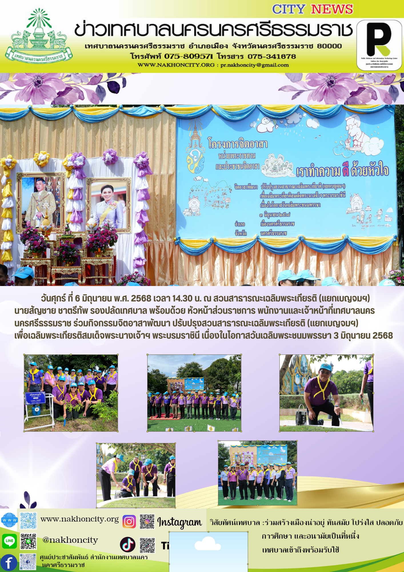 นายสัญชาย ชาตรีทัพ รองปลัดเทศบาล พร้อมด้วย หัวหน้าส่วนราชการ พนักงานและเจ้าหน้าที่เทศบาลนครนครศรีธรรมราช ร่วมกิจกรรมจิตอาสาพัฒนา ปรับปรุงสวนสาธารณะเฉลิมพระเกียรติ (แยกเบญจมฯ)เพื่อเฉลิมพระเกียรติสมเด็จพระนางเจ้าฯ พระบรมราชินี เนื่องในโอกาสวันเฉลิมพระชนมพรรษา 3 มิถุนายน 2568 |