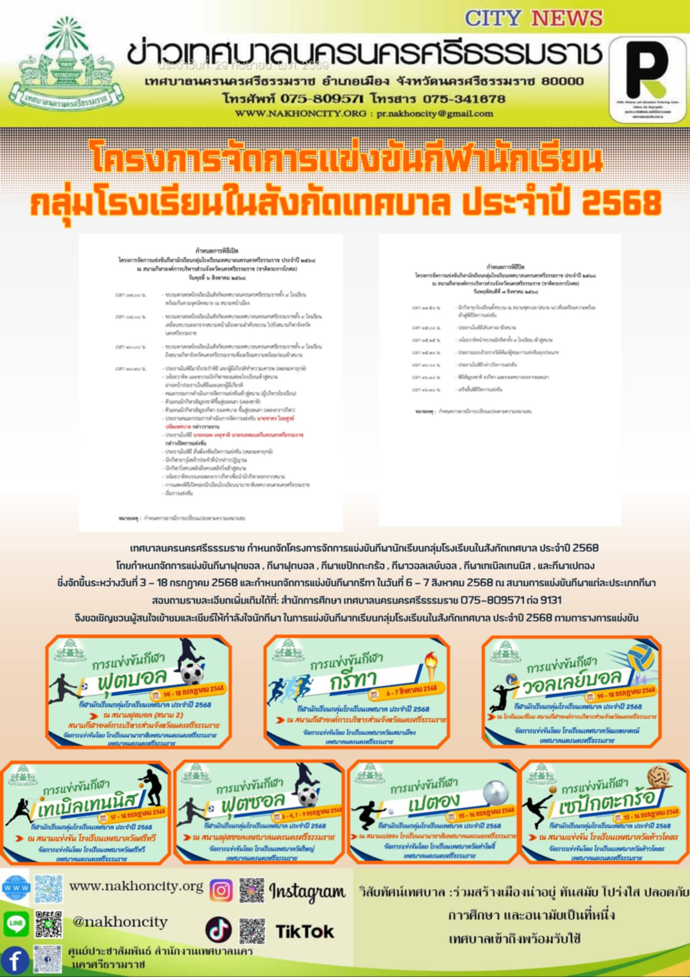 เทศบาลนครนครศรีธรรมราช กำหนดจัดโครงการจัดการแข่งขันกีฬานักเรียนกลุ่มโรงเรียนในสังกัดเทศบาลประจำปี 2568 |