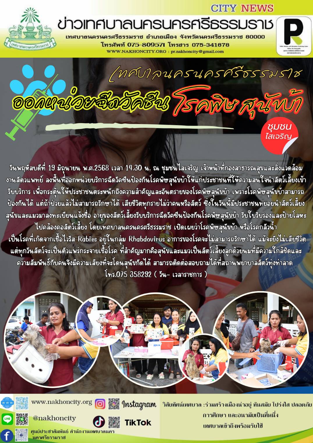 วันพฤหัสบดีที่ 19 มิถุนายน พ.ศ.2568 เวลา 14.30 น. ณ ชุมชนไสเจริญ เจ้าหน้าที่กองสาธารณสุขและสิ่งแวดล้อม งานสัตวแพทย์ ลงพื้นที่ออกหน่วยบริการฉีดวัคซีนป้องกันโรคพิษสุนัขบ้าให้แก่ประชาชนที่ให้ความสนใจนำสัตว์เลี้ยงเข้ารับบริการ เพื่อกระตุ้นให้ประชาชนตระหนักถึงความสำคัญและอันตรายของโรคพิษสุนัขบ้า เพราะโรคพิษสุนัขบ้าสามารถป้องกันได้ แต่ถ้าป่วยแล้วไม่สามารถรักษาได้ เสียชีวิตทุกรายไม่ว่าคนหรือสัตว์ ซึ่งในวันนี้มีประชาชนทยอยนำสัตว์เลี้ยง สุนัขและแมวมาลงทะเบียนแจ้งชื่อ อายุของสัตว์เลี้ยงรับบริการฉีดวัคซีนป้องกันโรคพิษสุนัขบ้า รับใบรับรองและป้ายโลหะไปคล้องคอสัตว์เลี้ยง โดยเทศบาลนครนครศรีธรรมราช เปิดเผยว่าโรคพิษสุนัขบ้า หรือโรคกลัวน้ำ เป็นโรคที่เกิดจากเชื้อไวรัส Rabies อยู่ในกลุ่ม Rhabdovirus อาการของโรคจะไม่สามารถรักษาได้ แม้จะยังไม่เสียชีวิต แต่ทุกวันสัตว์จะเป็นตัวแพร่กระจายเชื้อโรค ที่สำคัญมากคือสุนัขและแมวเป็นสัตว์เลี้ยงลูกด้วยนมที่มีความใกล้ชิดและความสัมพันธ์กับคนจึงมีความเสียงที่จะโดนสุนัขกัดได้ สามารถติดต่อสอบถามได้ที่สถานพยาบาลสัตว์ทุ่งท่าลาด โทร.075 358292 ( วัน- เวลาราชการ ) ……….... ภาพ//ข่าว//จันทร์จิรา |