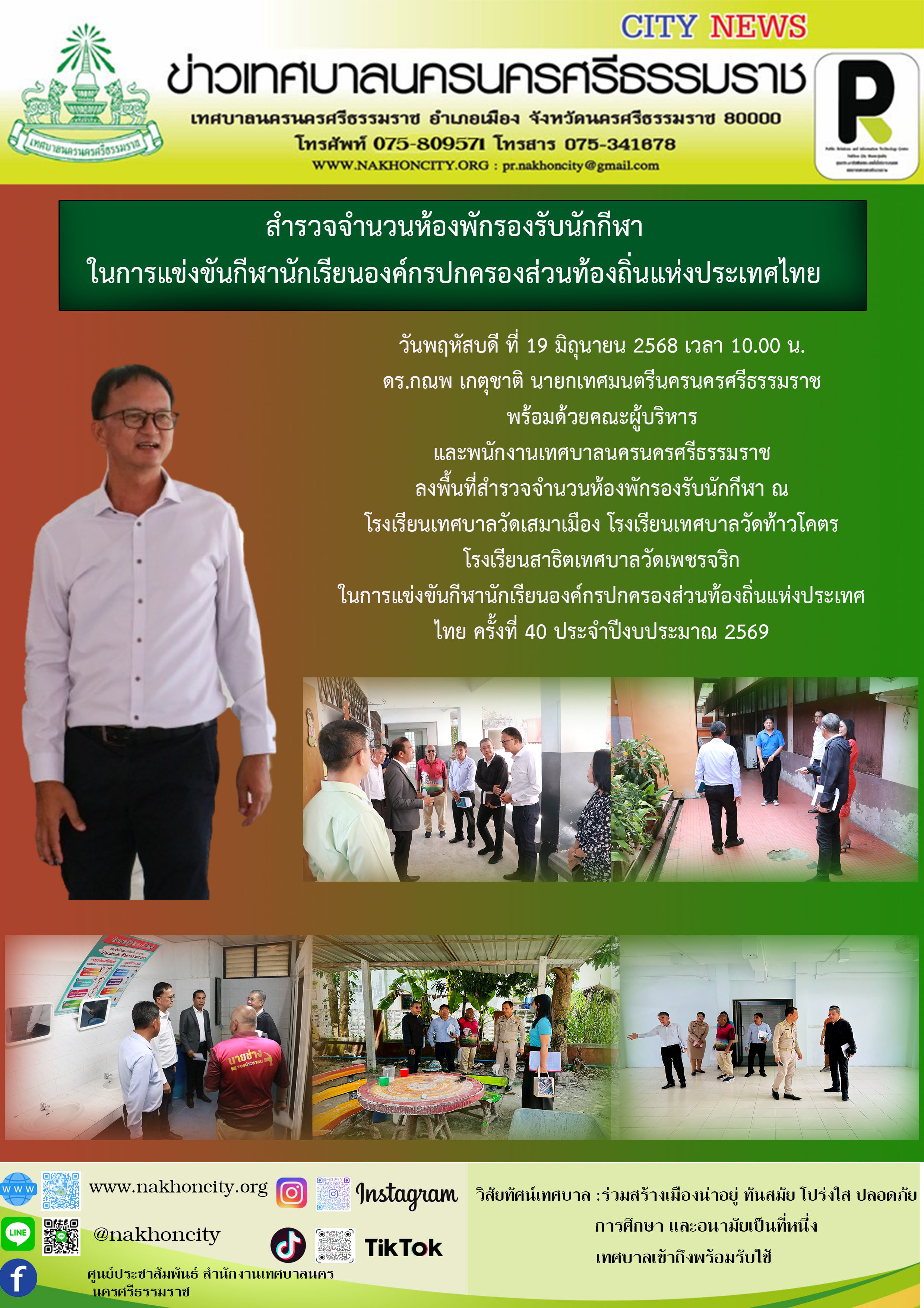 นายกเทศมนตรีนครนครศรีธรรมราช ลงพื้นที่สำรวจจำนวนห้องพักรองรับนักกีฬา ในการแข่งขันกีฬานักเรียนองค์กรปกครองส่วนท้องถิ่นแห่งประเทศไทย ครั้งที่ 40 ประจำปีงบประมาณ 2569 |